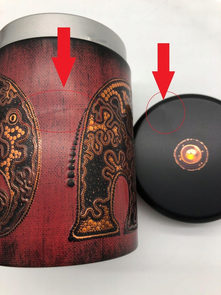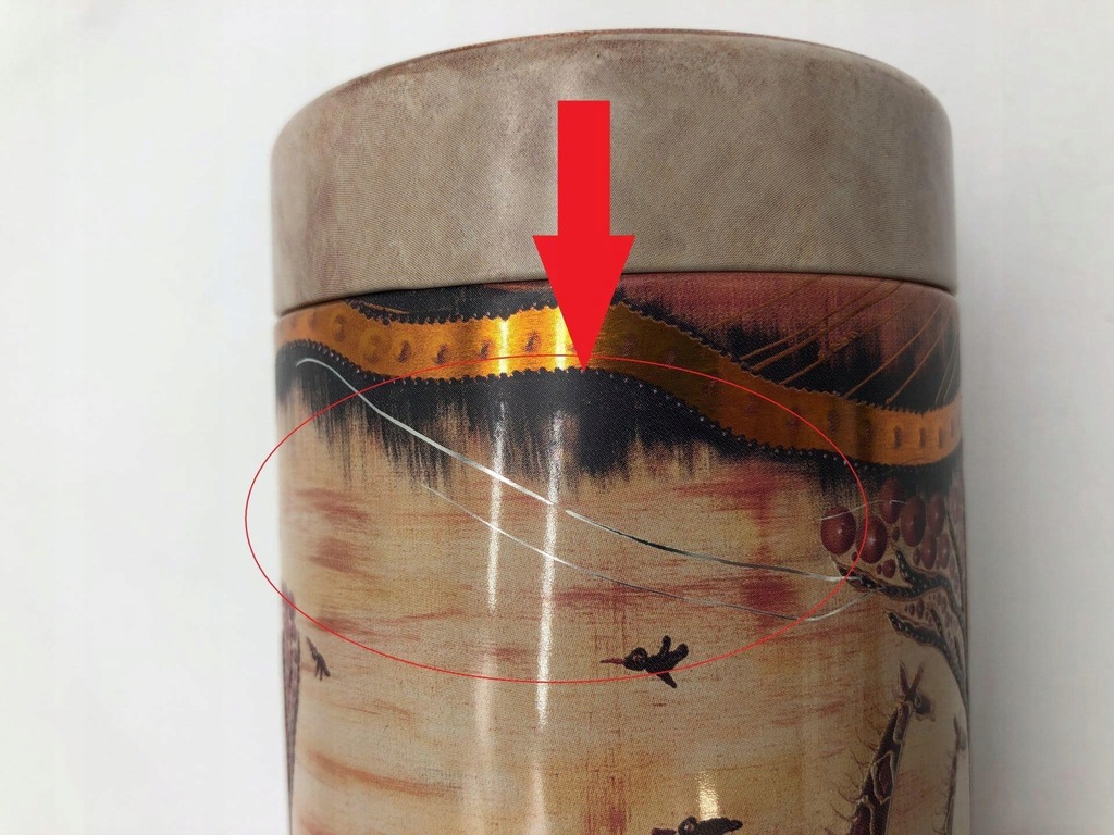 Wada w postaci rysy i wgnieceń, oznaczona na zdjęciach.