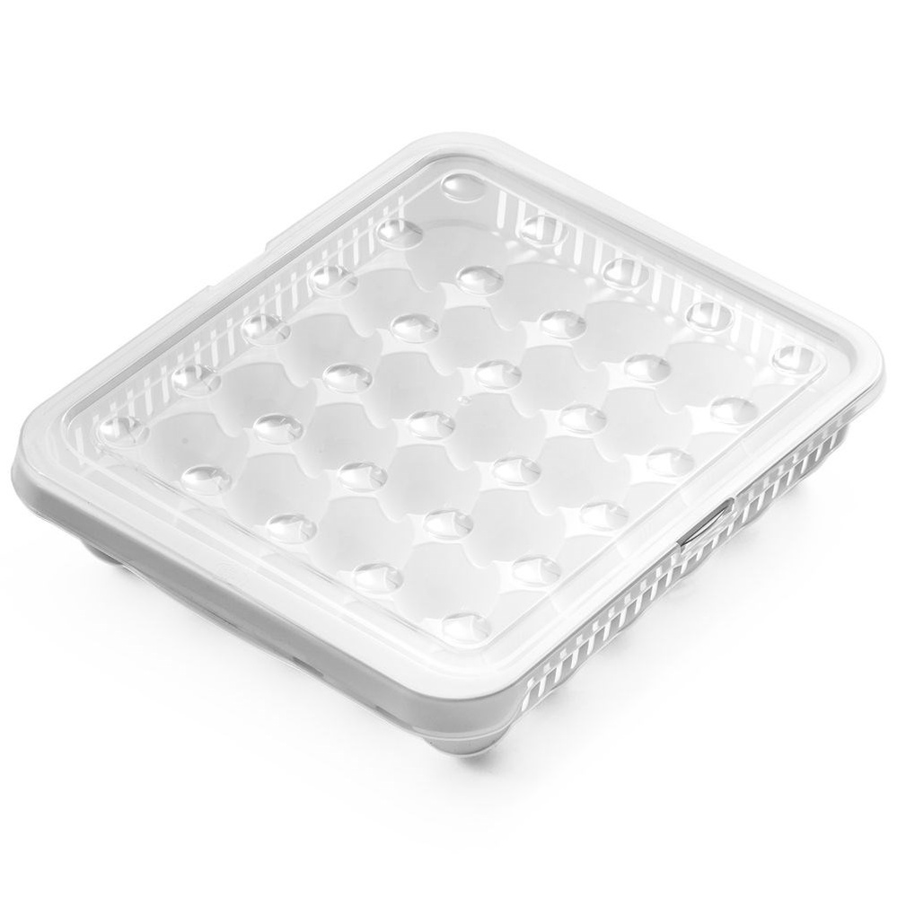 Pojemnik do przechowywania i transportu 30 sztuk jajek. Posiada pokrywkę, więc można na czas podróży go zamknąć, wówczas mamy pewność, że podczas przenoszenia jajka nam nie wypadną. Idealnie sprawdzi się podczas zakupów jajek, wówczas nie musimy używać jednorazowych opakowań. Wyprodukowano zgodnie z europejskimi standardami.