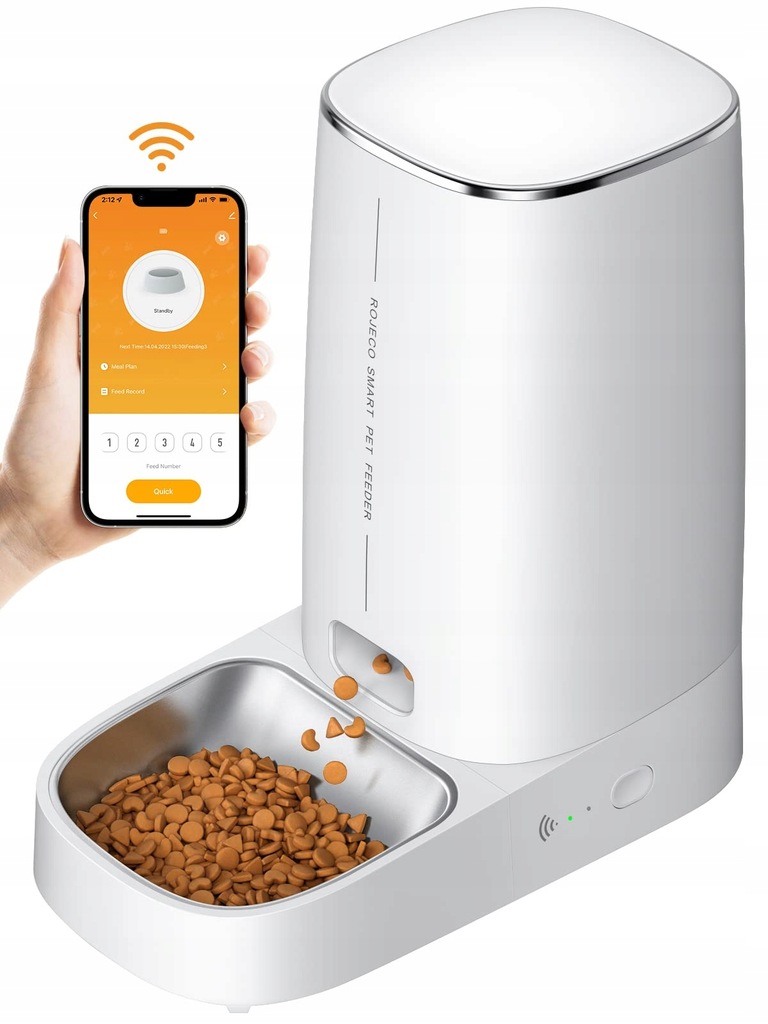 Inteligentny dozownik karmy Rojeco oferuje aż 4 l pojemności i zapewnia dostęp do świeżej i suchej karmy. Dlaczego warto go wybrać? Dzięki innowacyjnemu systemowi i wykorzystaniu delikatnej gumy do mieszania ziaren urządzenie zapewnia bezproblemowe podawanie jedzenia. Dodatkowo wyposażono je we wbudowany czujnik, który monitoruje poziom pożywienia i automatycznie powiadamia o konieczności uzupełnienia zbiornika.