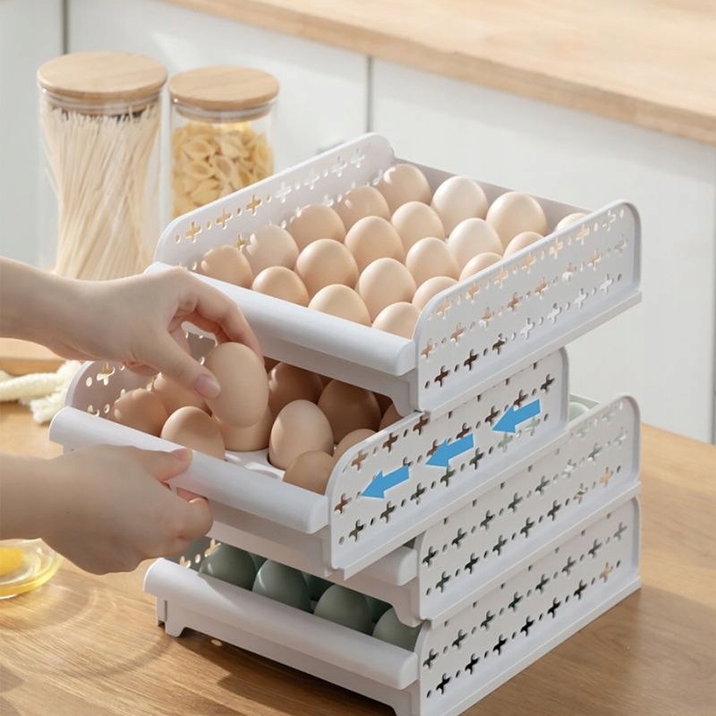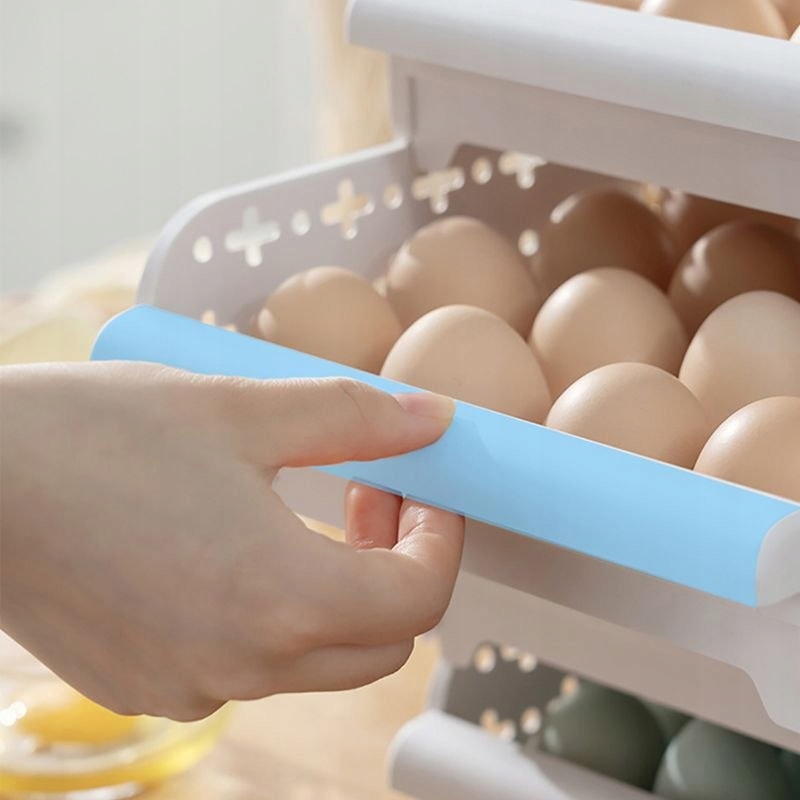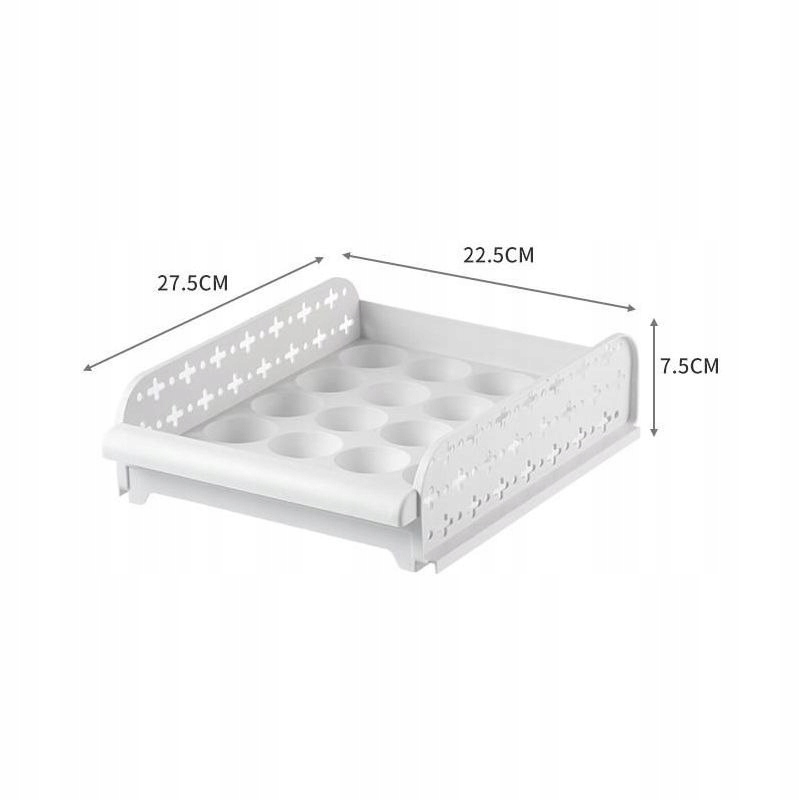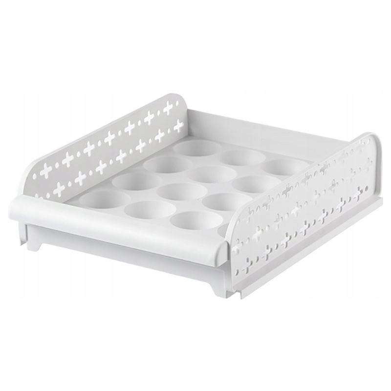 Praktyczny pojemnik do przechowywania jajek, zapewniający odpowiednią wentylację. Istnieje możliwość ułożenia tacek jedna na drugą i przesuwania nimi jak szufladami.