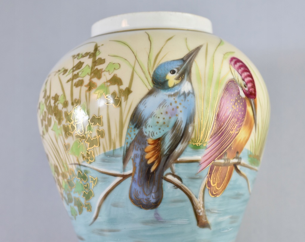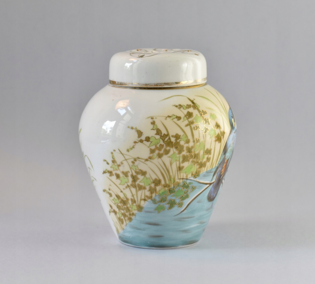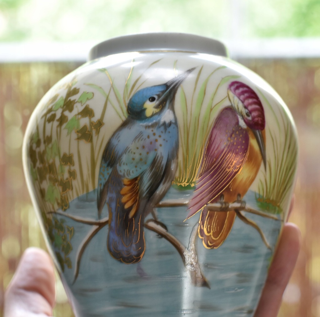 Barwna dekoracja z motywem dwóch ptaszków siedzących na gałęzi, tuż nad wodą w otoczeniu bujnej roślinności. Nieco orientalna uroda jednego z zimorodków to zapewne fantazyjna interpretacja artysty. Porcelana jest w całości zdobiona ręcznie.