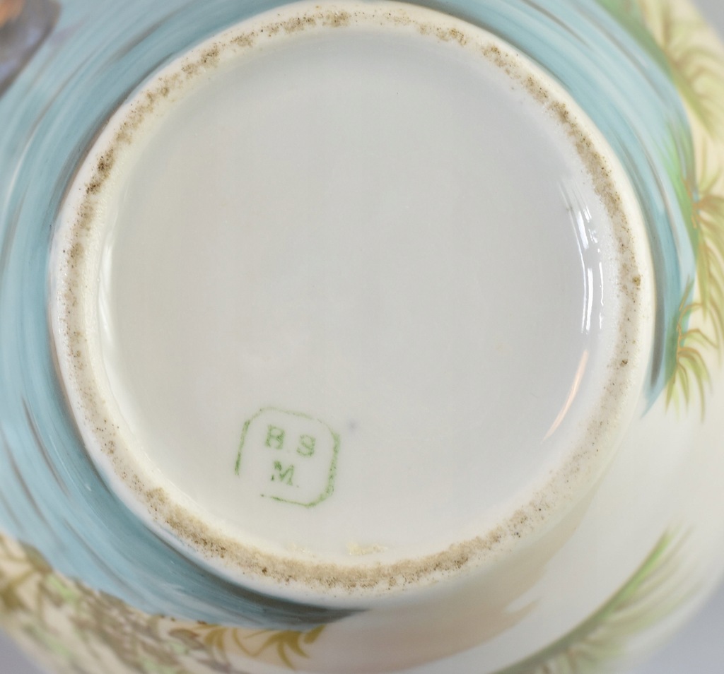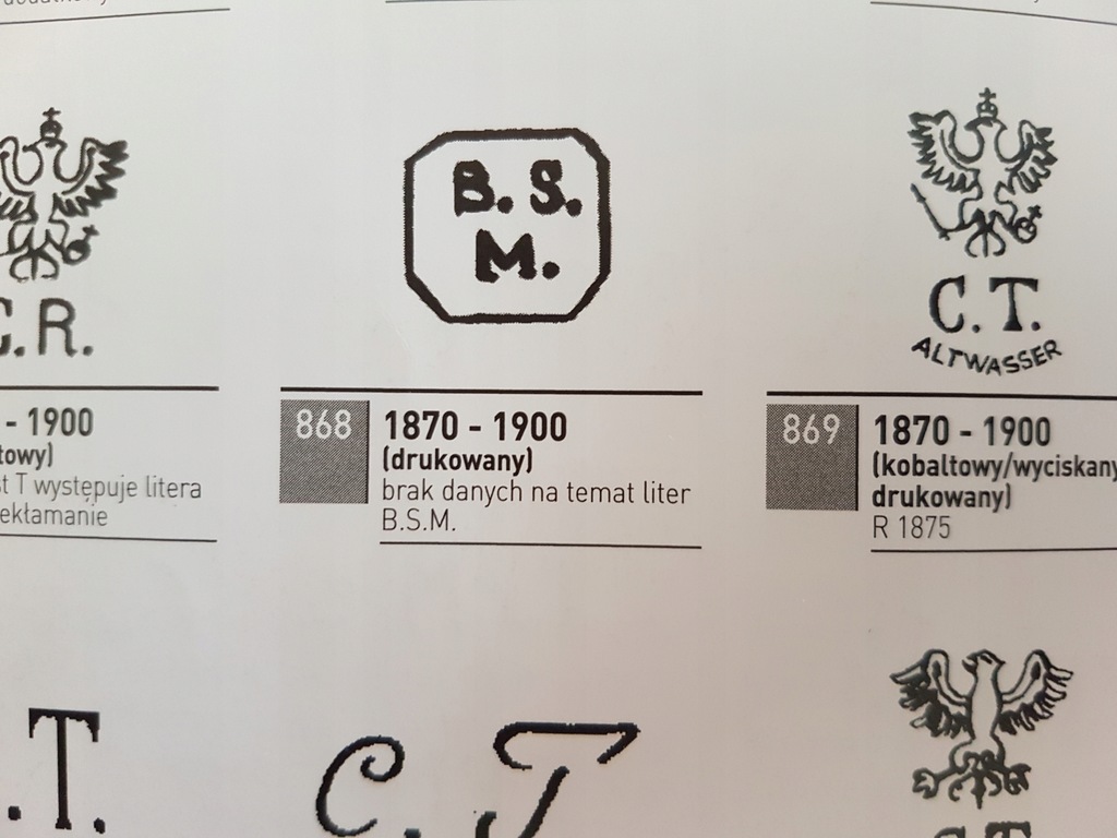 Pojemnik jest sygnowany rzadko występującym znakiem B.S.M., który datowany jest na lata 1870 - 1900 (wg. Encyklopedii Śląskiej Porcelany).
