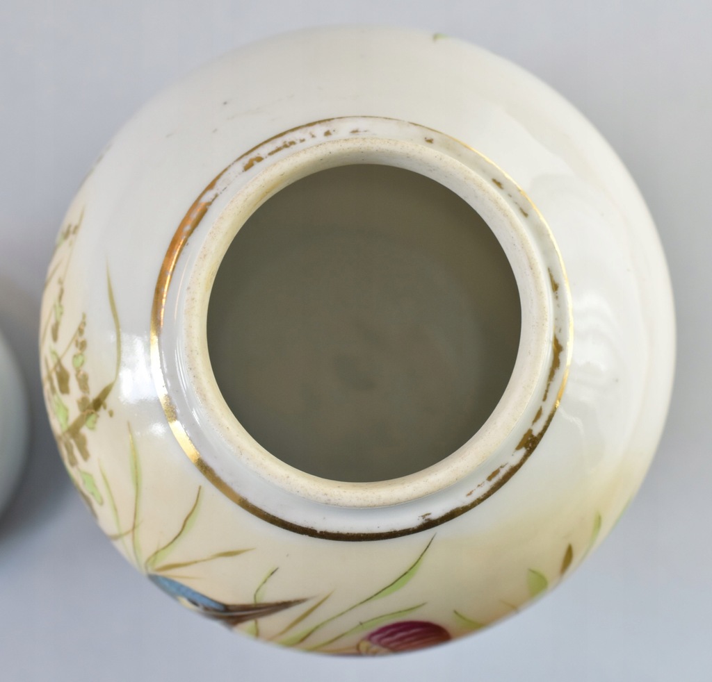 Stan: bardzo ładny stan utrzymania, szczególnie dekoracji; miejscowo małe ślady użytkowania / przetarcia złoceń; podstawa ma minimalną nierówność, pojemnik stoi stabilnie, ale poruszony może się lekko zachwiać.