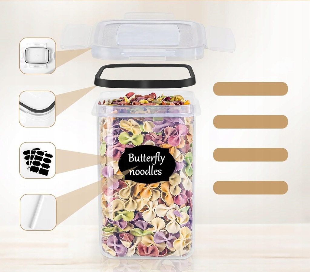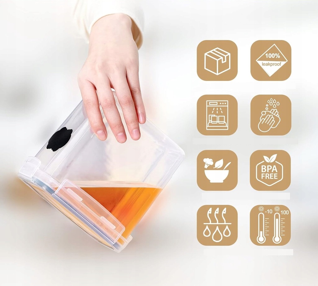 - Te hermetyczne zamknięcie pozwala sypkim produktom, takim jak mąka, cukier, ryż, zboża, orzechy, fasola, przekąski, makaron, kawa i herbata pozostać suche. Również idealnie nadają się do przechowywania środków płynnych, takich jak woda, sok, zupa i wiele innych.