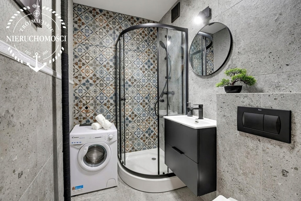 Łazienka z kabiną prysznicową oraz pralką.
