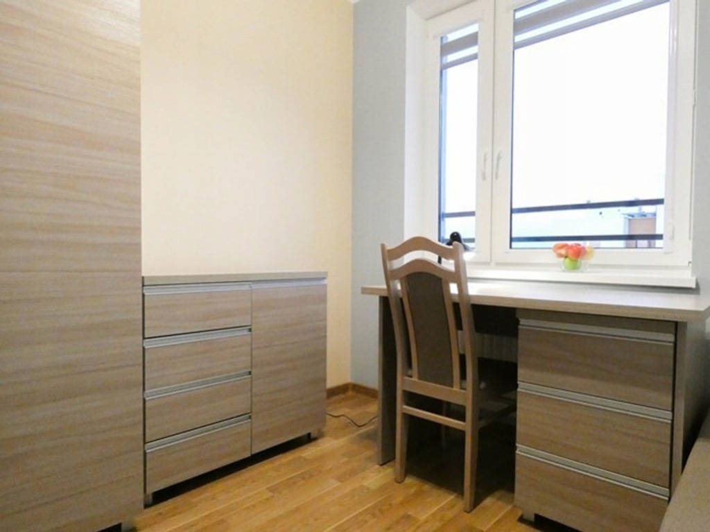 *Jasny pokój: pojedyncze łóżko, pojemna szafa na ubrania, komoda, biurko i szafka z półkami na książki