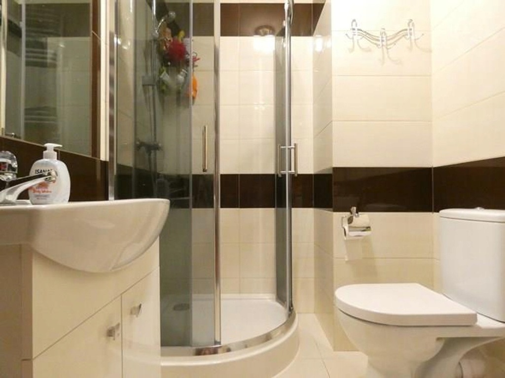 Łazienka: kabina prysznicowa, umywalka, WC, pralka i 2 szafki.