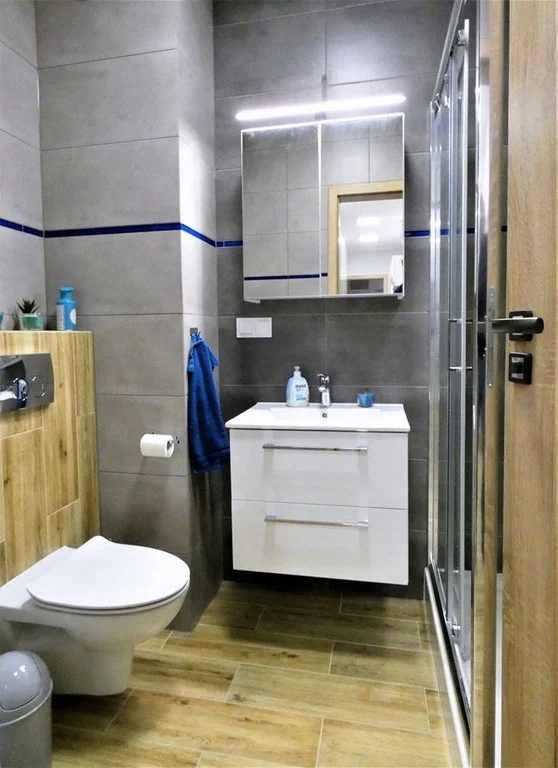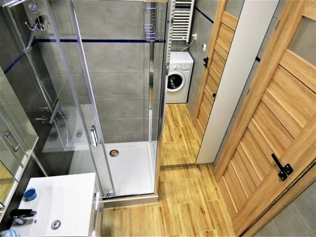 *Łazienka razem z WC: szafka wisząca z lustrem, kabina prysznicowa, pralka, szafa z lustrem.