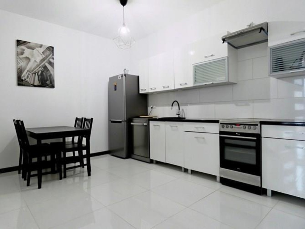 Kuchnia: lodówko-zamrażarka, okap, 4-palnikowa płyta indukcyjna, zmywarka, piekarnik, zlew.