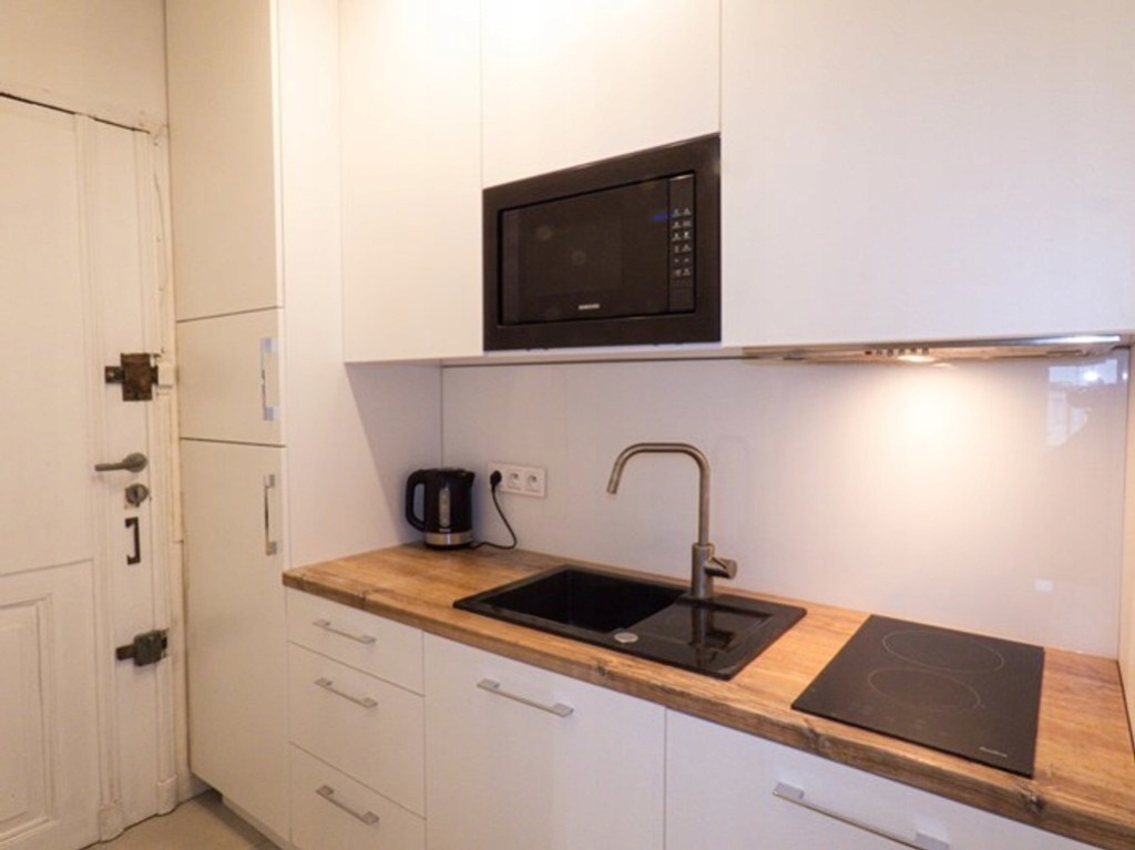 *Kuchnia: szafki, lodówka, płyta elektryczna, zlewozmywak, mikrofalówka