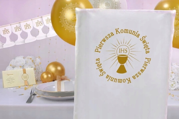 Pokrowiec komunijny z pięknym, złotym nadrukiem wykonany z satynowego błyszczącego materiału