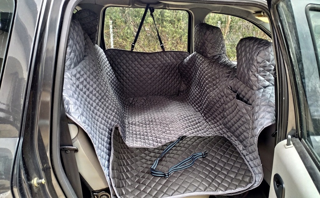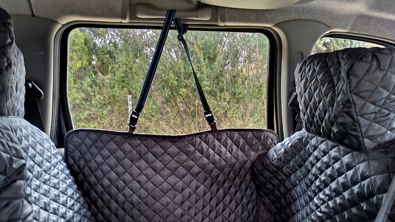 Dodatkowo pokrowiec zwiększa bezpieczeństwo, poprzez zasłonięcie przestrzeni pomiędzy przednimi fotelami, utrudnia przejście psa do przodu samochodu.