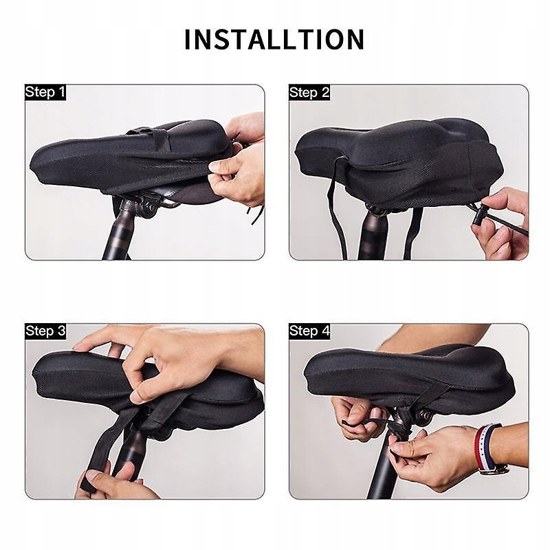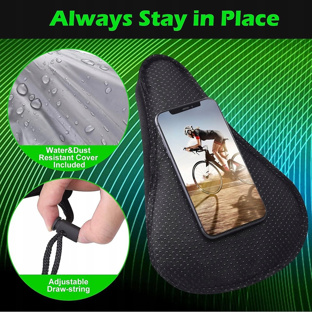 SUPER WYGODNY SILIKON: Pokrowiec na siodełko rowerowe pomoże Ci pozbyć się bólu podczas jazdy i znów cieszyć się jazdą. Antypoślizgowa konstrukcja: Pokrowiec na siodełko ma antypoślizgowe cząsteczki na spodzie, bez względu na to, jak daleko wiosłujesz, pozostanie mocno na siodełku. Łatwa instalacja: zamontuj pokrowiec na siodełku roweru, dokręć paski i zabezpiecz paski, 3 kroki, aby zabezpieczyć pokrowiec na miejscu. Jeden rozmiar pasuje do większości - Siodełka żelowe mają wymiary 28 x 18 cm dla wąskich siodełek, takich jak siodełka MTB i siodełka szosowe. Z wodoodpornym siodełkiem - Pasuje do większości siodełek rowerowych, chroni siodełko przed wodą i kurzem podczas parkowania na deszczowych lub zakurzonych drogach. Zawiera: poduszkę na siodełko i pokrowiec przeciwdeszczowy