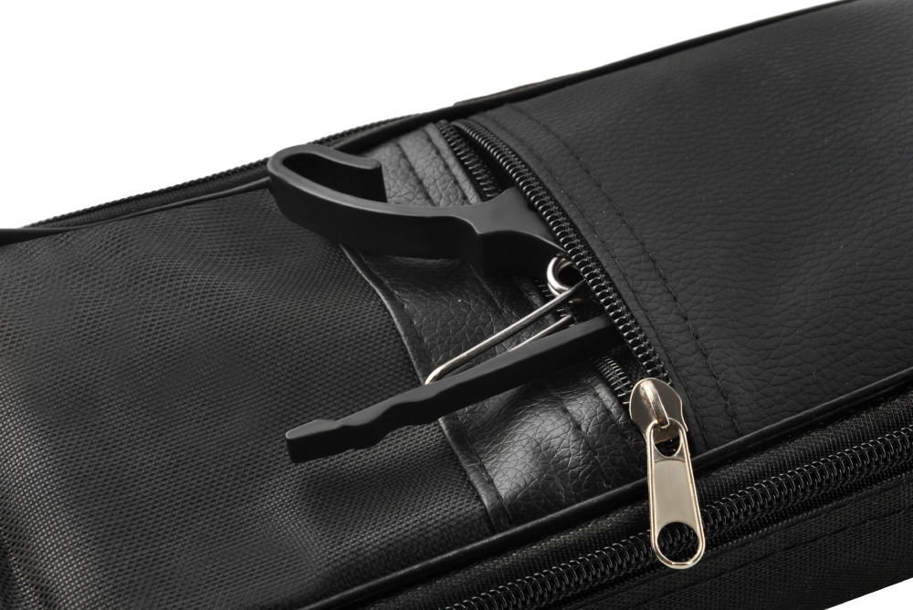 Z przodu zamieszczono dwie kieszenie: dużą kieszeń mieszczącą format a4 – bez problemu zmieścimy tam nuty i wiele innych drobiazgów oraz małą, do której możemy włożyć kapodaster, kostki itd. Całość zamykana jest na dwa suwaki.
