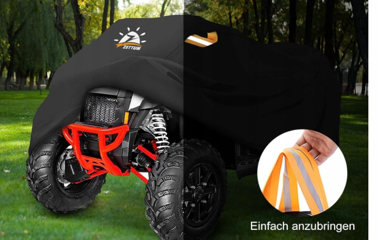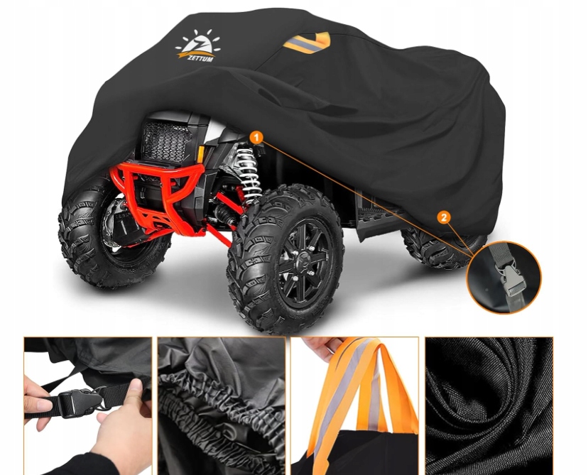Pokrowiec wyposażony jest w pasy mocujące, które umożliwiają solidne i bezpieczne przymocowanie go do quada, zapobiegając zsuwaniu się i zapewniając stabilność nawet przy silnym wietrze.