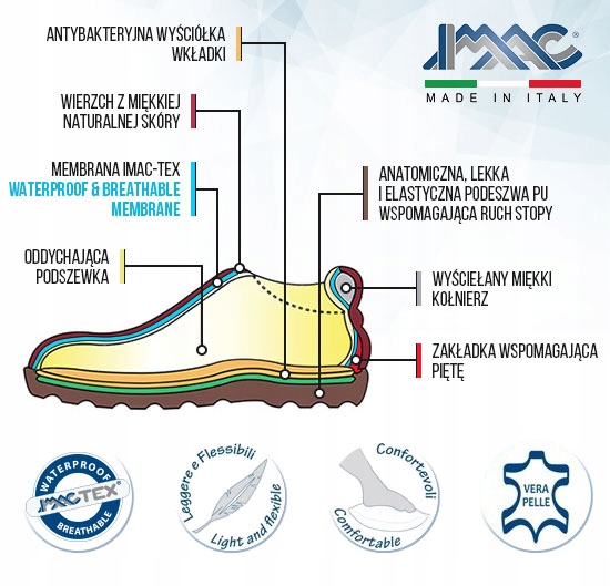 Wysoka jakość wykonania, komfort i wygoda oraz trwałość, to niezaprzeczalne atuty tego obuwia. Włoska marka IMAC od lat jest doceniana i lubiana przez zadowolonych użytkowników zarówno ww Włoszech, jak i w całej Europie.