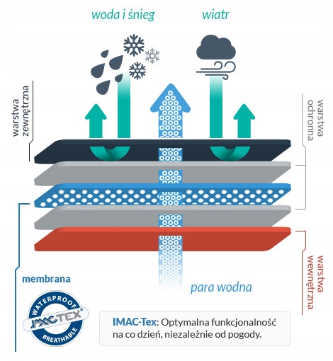Zastosowanie wewnątrz obuwia membrany IMAC-TEX WaterProof Membrane zapewnia optymalną wodoszczelność i wiatroszczelność, przy równoczesnym zachowaniu optymalnej oddychalności obuwia.