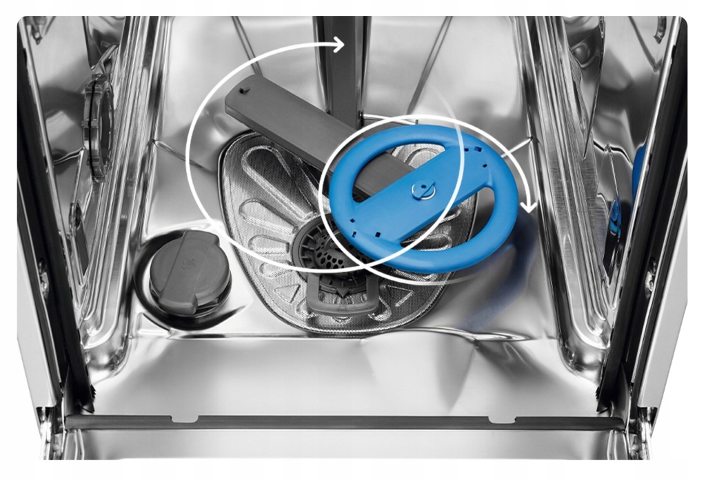 Dwa rotacyjne ramiona spryskujące sprawiają, że wszystkie naczynia są idealnie czyste, ponieważ woda jest równomiernie rozprowadzana po całym urządzeniu.