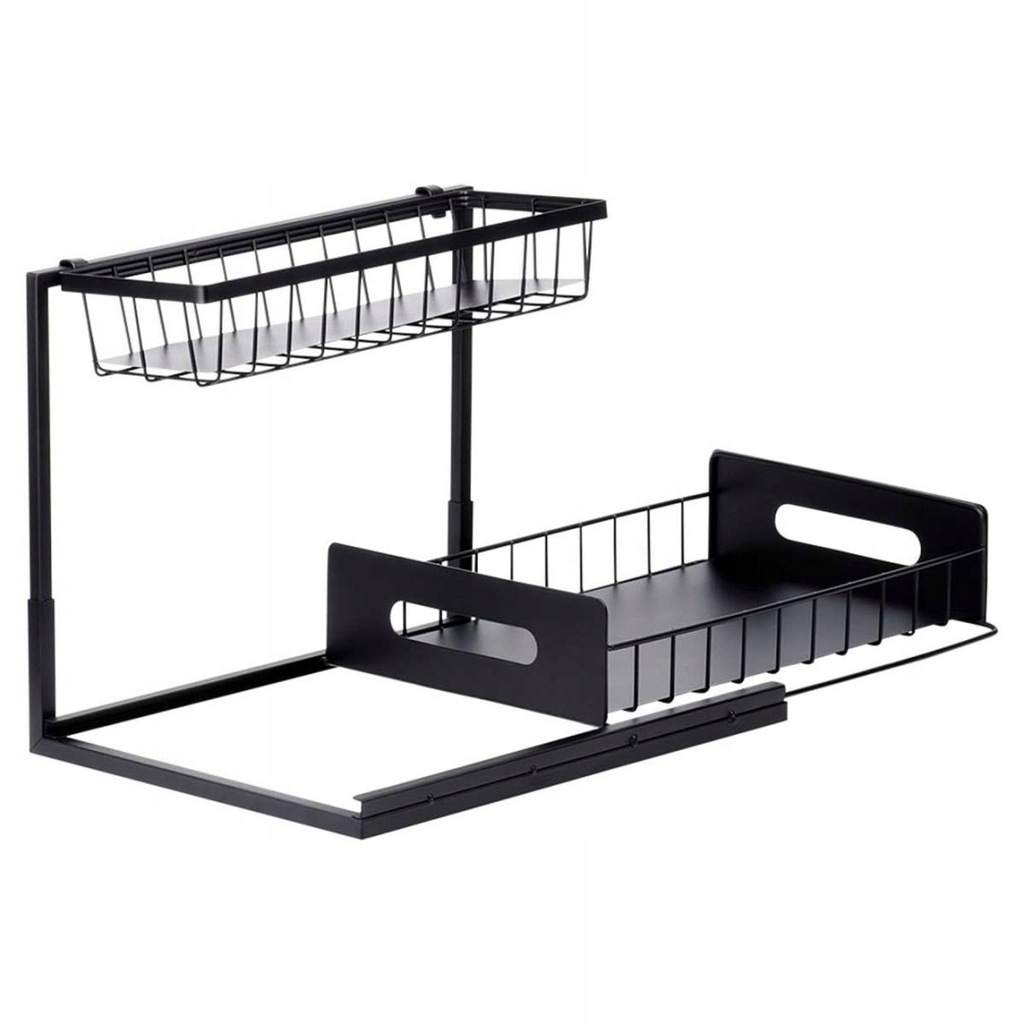 Dwupoziomowa półka kuchenna z wysuwaną dolną szufladą. Idealna do organizacji przypraw, słoiczków i butelek. Metalowa w czarnym kolorze.