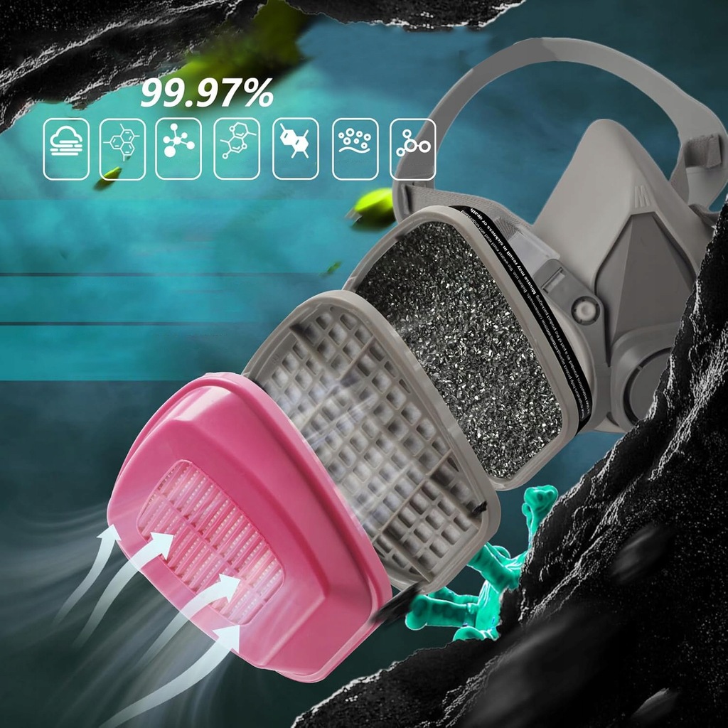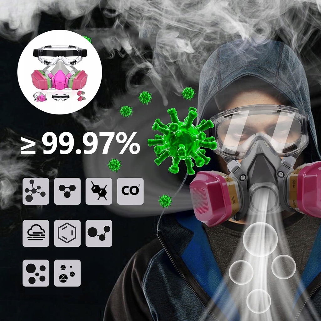 🔵☠️😷Wysoka skuteczność filtracji 99,97%: Maska przeciwpyłowa wyposażona jest w element filtrujący 60926, który składa się z podwójnego systemu filtracji wykonanego z bawełny i węgla aktywnego, który skutecznie filtruje 99,97% par organicznych, chloru, chlorowodoru, dwutlenek siarki, siarkowodór, amoniak i metyloamina, formaldehyd lub kwas fluorowodorowy, a także cząsteczki nietłuste i oleiste, dzięki czemu możesz bezpiecznie oddychać