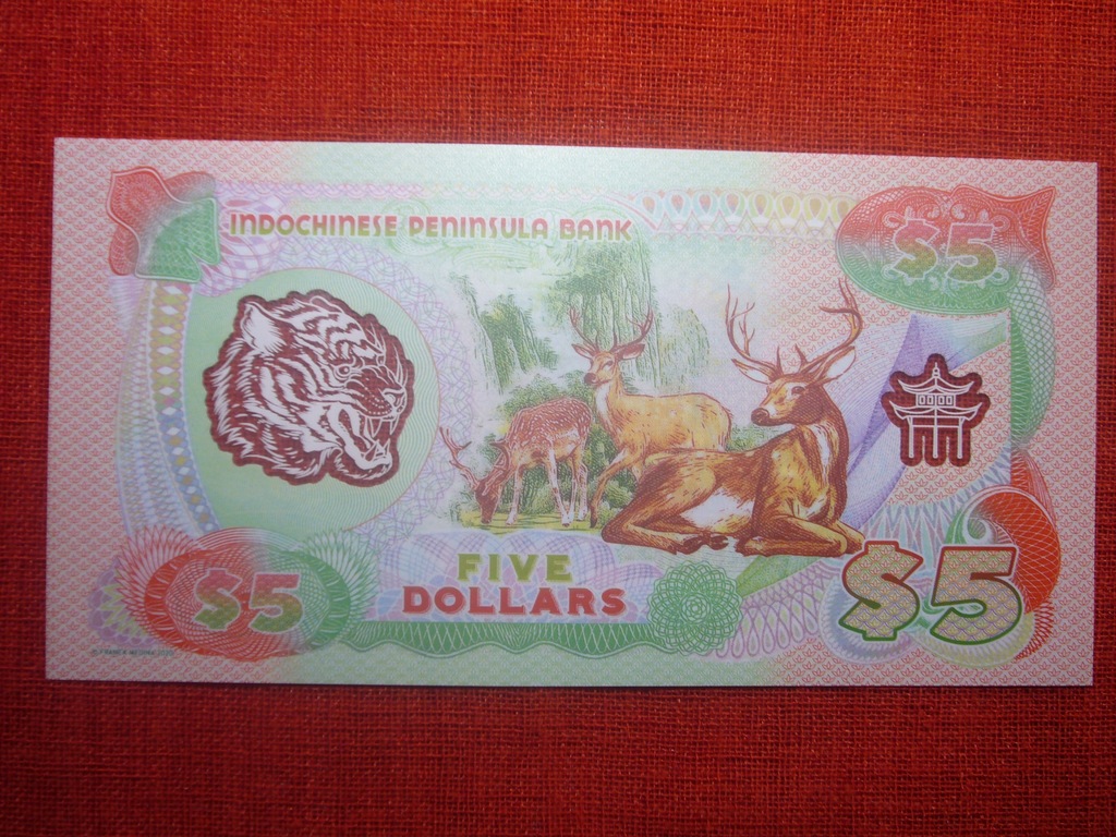 Banknot utrzymany w stylistyce oryginalnych banknotów z tamtego rejonu, bardzo efektowny, starannie wydany, pastelowa kolorystyka, dużo szczegółów, przeźroczyste "okienka" (głowa tygrysa, i graficzne przedstawienie świątyni), indywidualna numeracja.