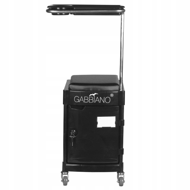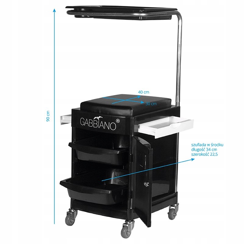 Funkcjonalny pomocnik kosmetyczny na sprzęt i narzędzia. Niezastąpiony w codziennej pracy, dzięki kółkom i siedzisku może służyć jako taboret. Pomocnik jest łatwy do przesuwania, posiada 2 wysuwane półki i dzwie zamykane szuflady.