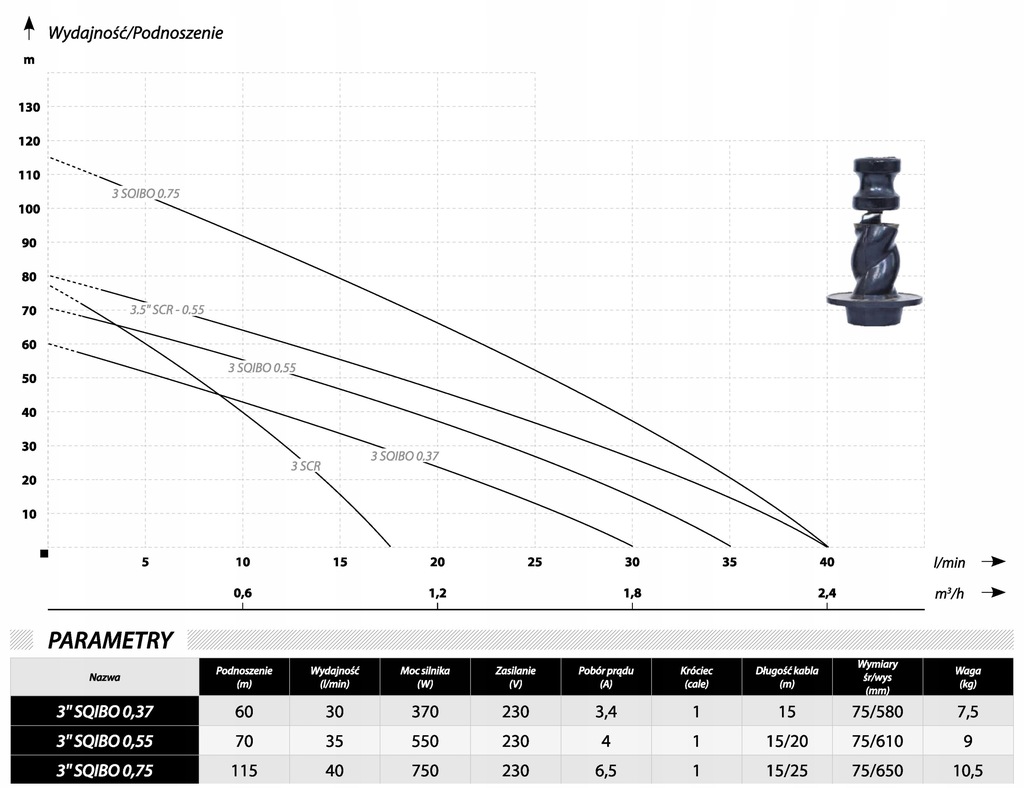 Wyporowe pompy głębinowe o średnicy 76mm. Pompy w głównej mierze wykonane zostały ze stali nierdzewnej np. obudowa, śruby, króćce oraz rotor. Pompy wyposażone zostały w różnej długości przewody elektryczne zakończone wtyczką w zależności od potrzeb użytkownika. Dzięki zabudowaniu kondensatora w silniku, od razu po rozpakowania pompa jest gotowa do montażu. Pompa wyposażana została w zabezpieczenie termiczne zamontowane w uzwojeniu silnika. Pompy z serii SQIBO są jednymi z najpopularniejszych pomp śrubowych na polskim rynku. Uznanie klientów zyskały dzięki solidnej konstrukcji i atrakcyjnej cenie.