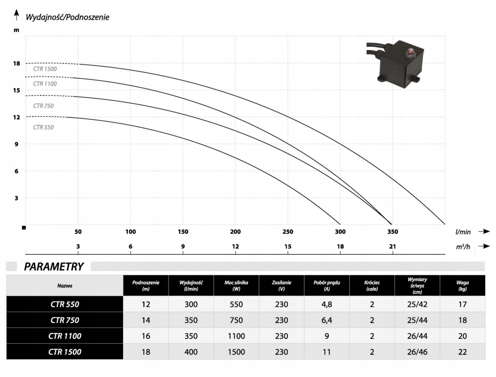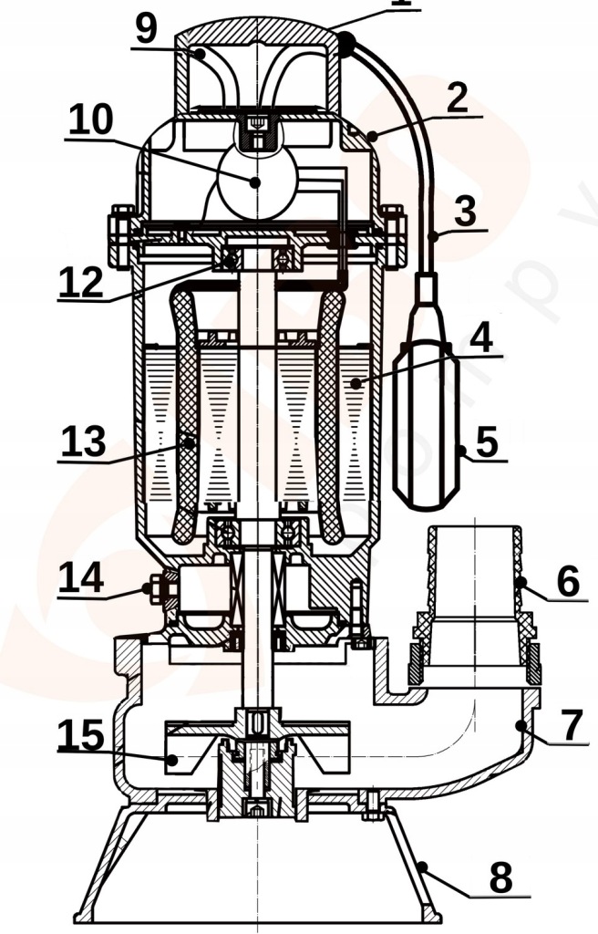 W pompach zamontowany został wyłącznik pływakowy, który umożliwia automatyczną pracę urządzenia. W celu zapewnienia bezawaryjnej pracy pompy zostały wyposażone w zabezpieczenie przeciążeniowe zamontowane na kablu.