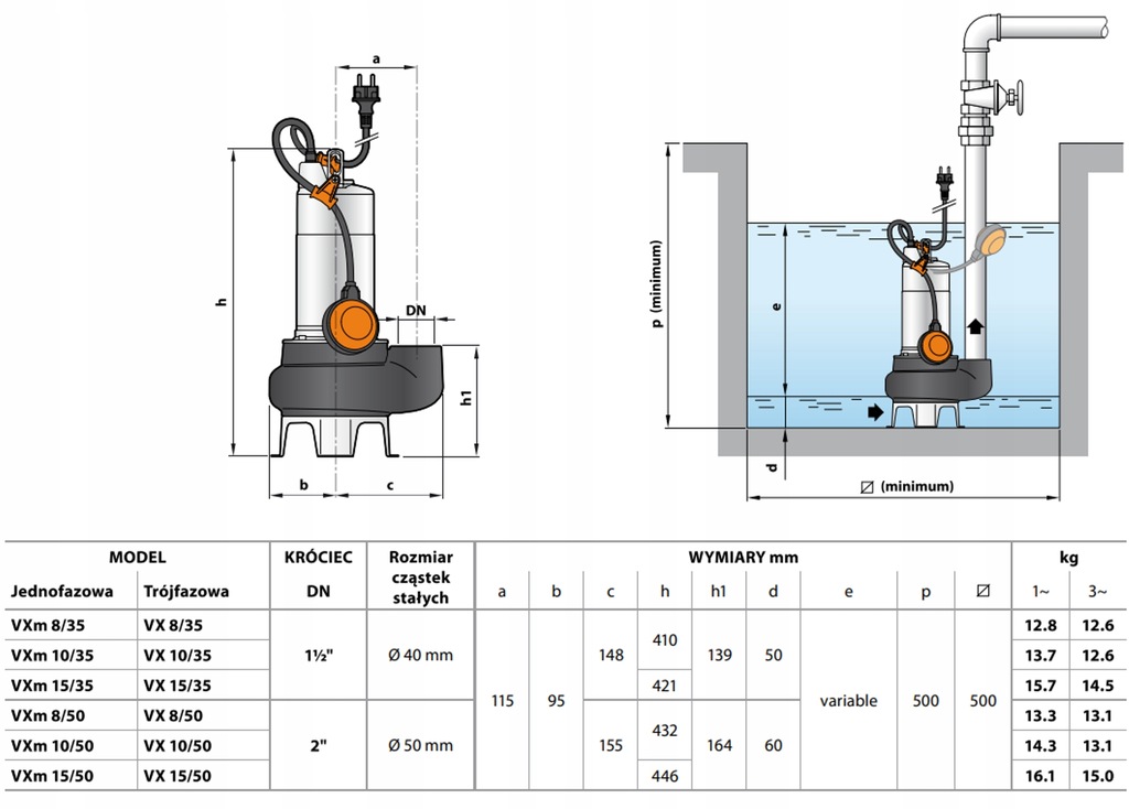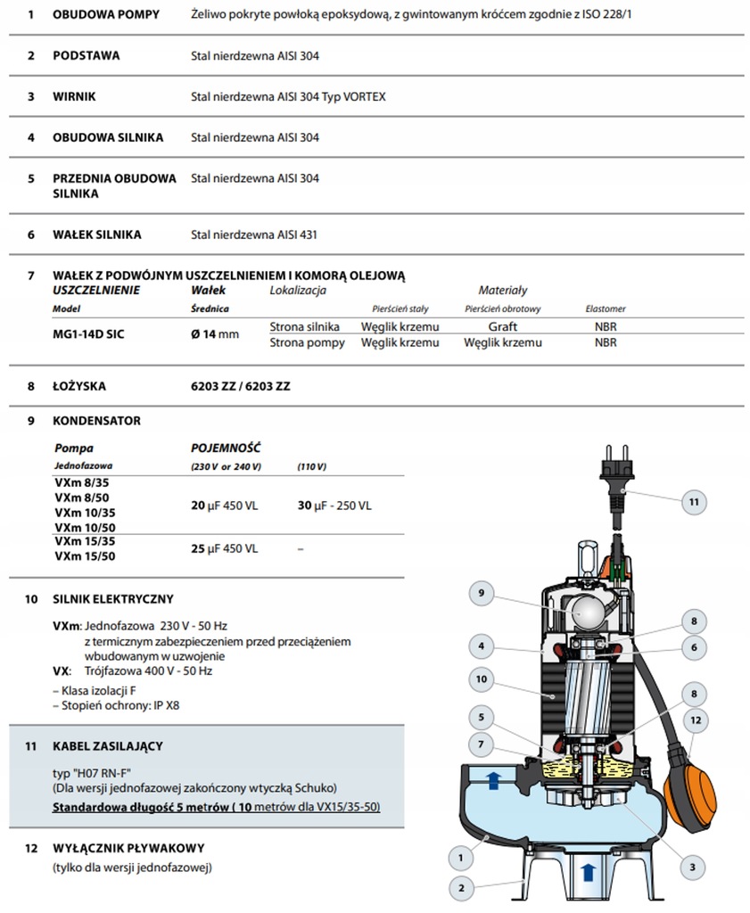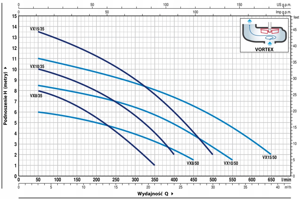 VX to seria pomp przeznaczonych do tłoczenia wody i ścieków z elementami stałymi. W wersji VORTEX zastosowano specjalny wirnik. Wszystkie elementy stałe przepływają pod wirnikiem, ograniczając jego kontakt z pompowanym medium i minimalizując ryzyko zapchania.