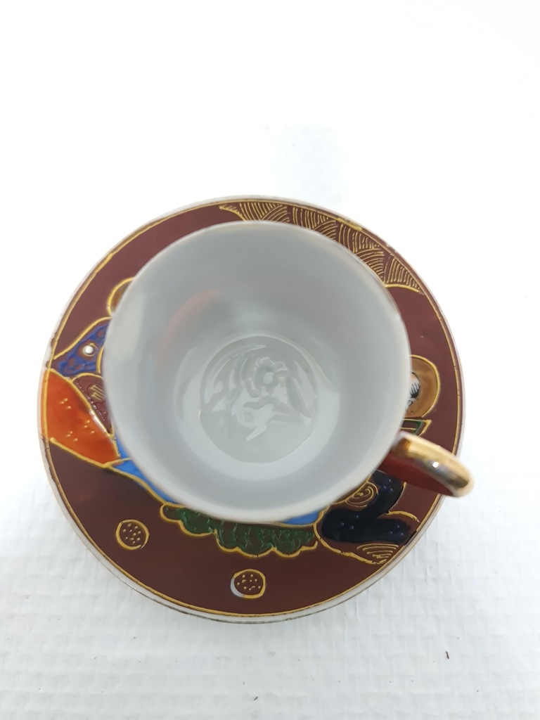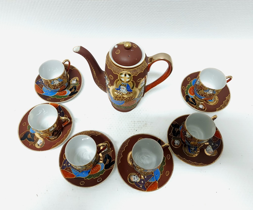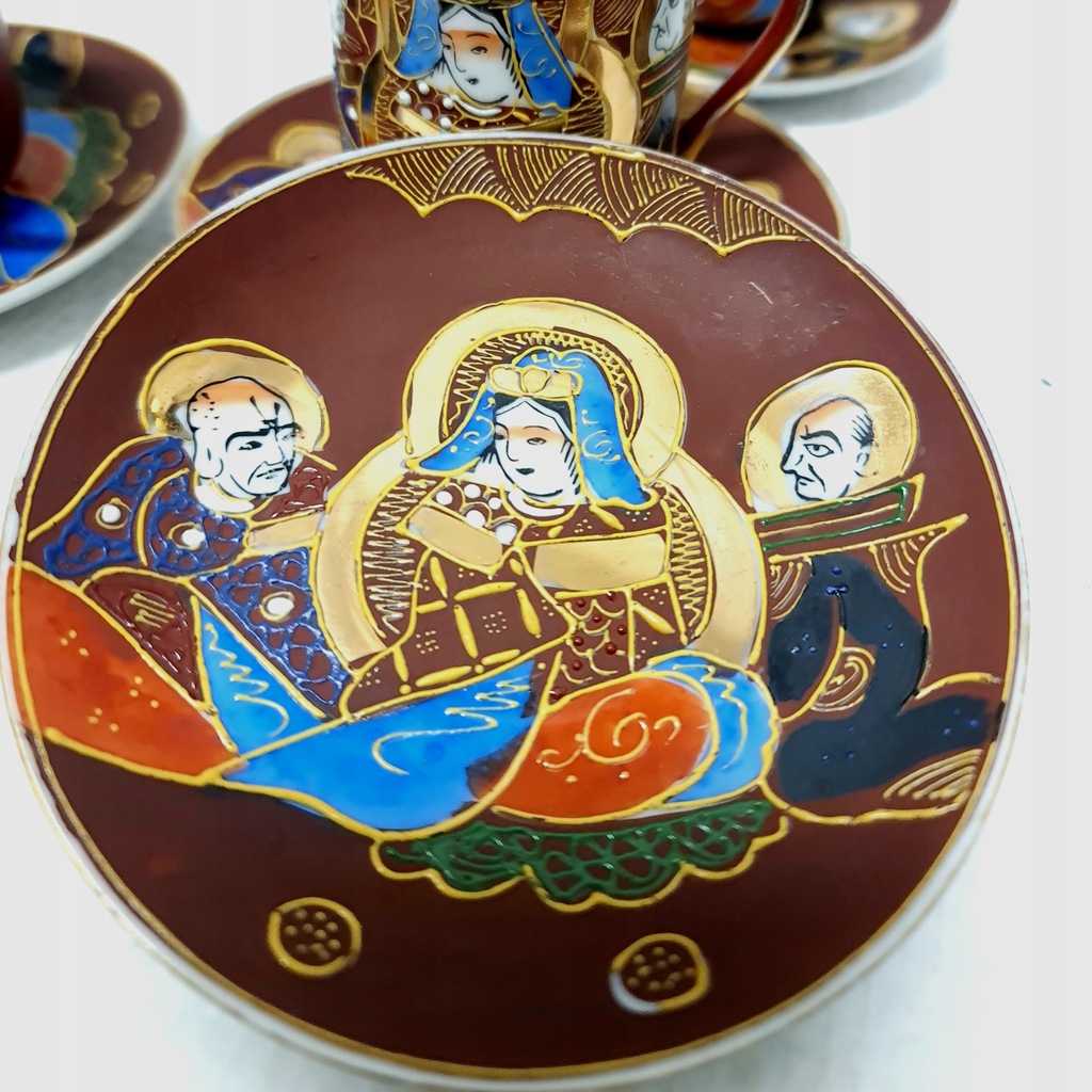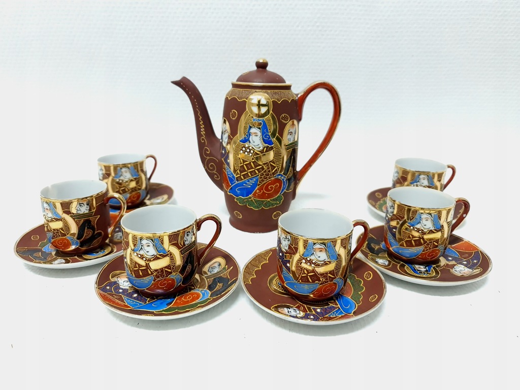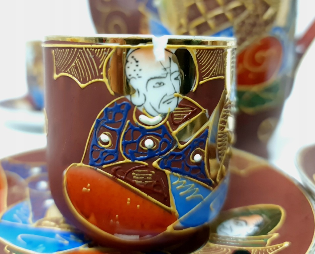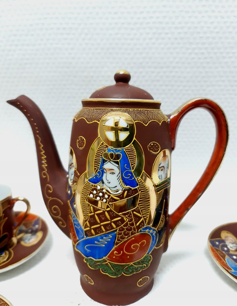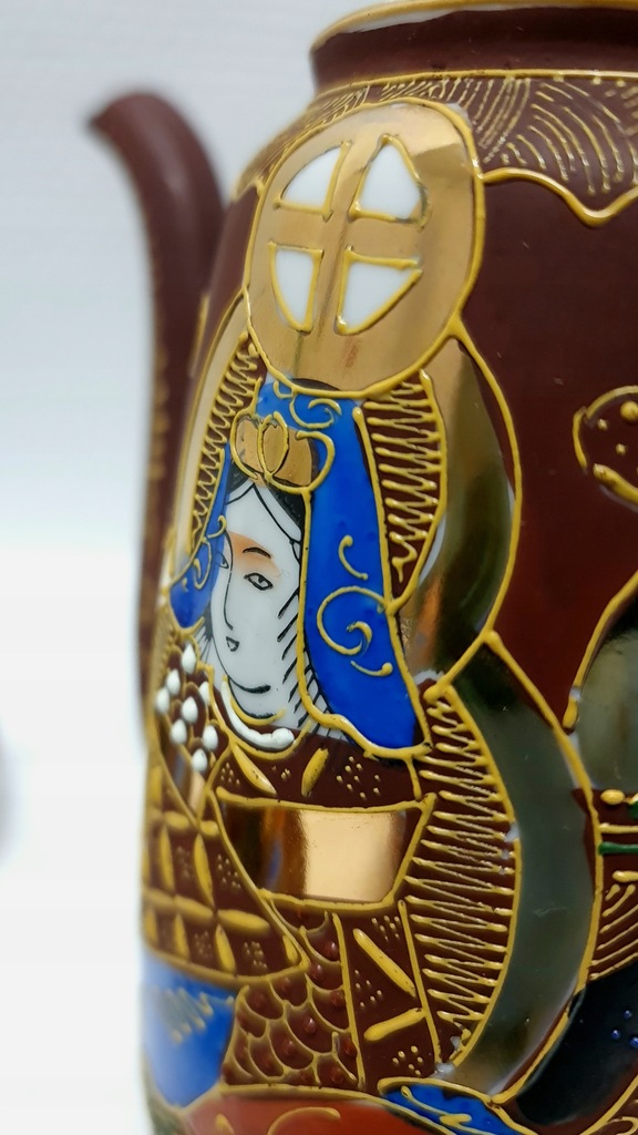 Wykonana w technice moriage. Jest to termin używany do opisania techniki zdobienia, warstwowych wypukłości na powierzchni ceramiki, która może być szkliwiona zarówno przed, jak i po emaliowaniu aplikacji. Dekoracje ceramiki typu satsuma występują bardzo często w niezwykle bogatym otoczeniu złota, jak w tym komplecie. Jest inkrustowany 24-karatowym złotem.