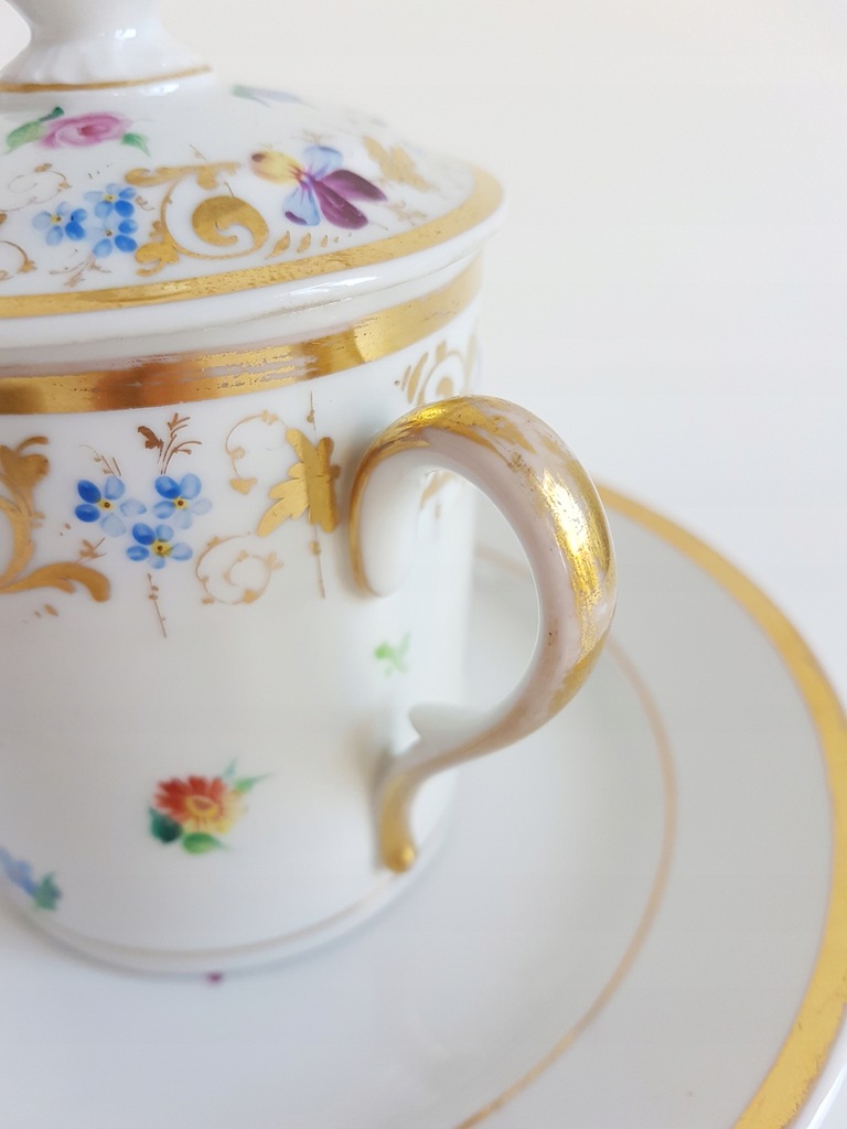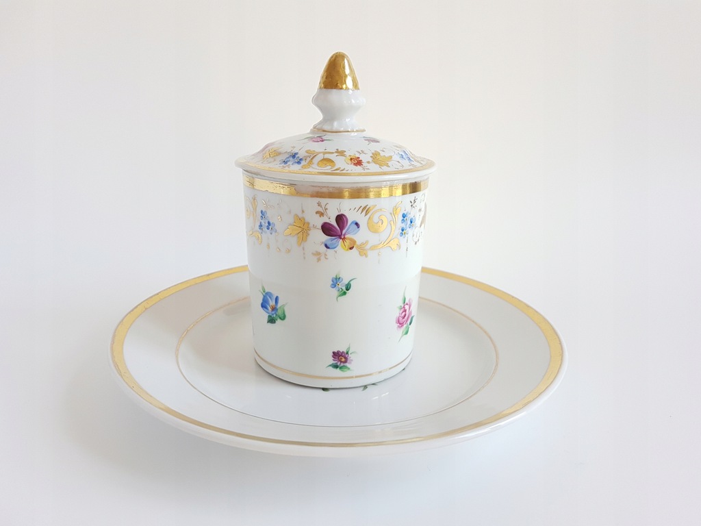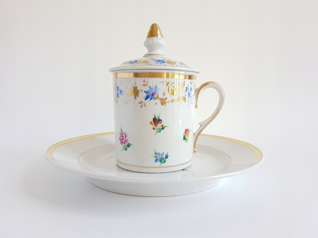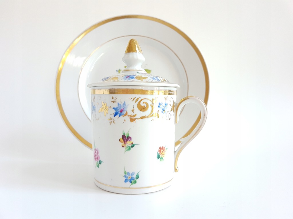 XIX-wieczny porcelanowy kubek z przykrywką i talerzykiem deserowym z malowanymi kwiatami. Kubek dekorowany jest drobnymi kwiatkami rozproszonymi po całej powierzchni i wplecionymi złotymi akcentami. Talerzyk zdobiony bukietem kwiatów w środku lustra i złoceniem na rancie.