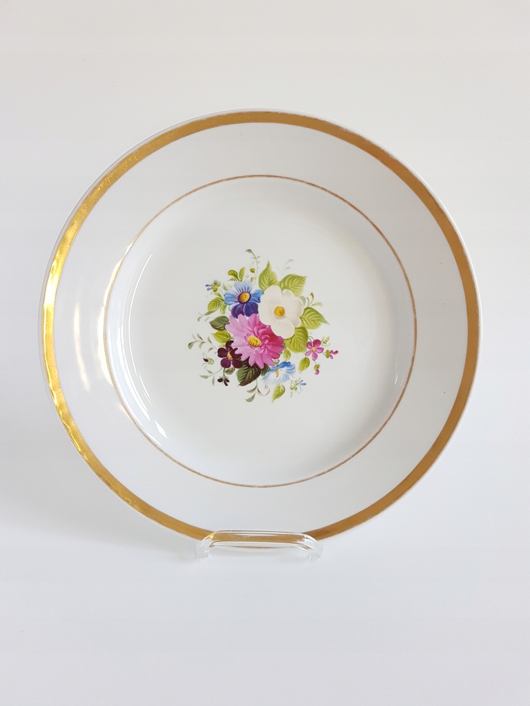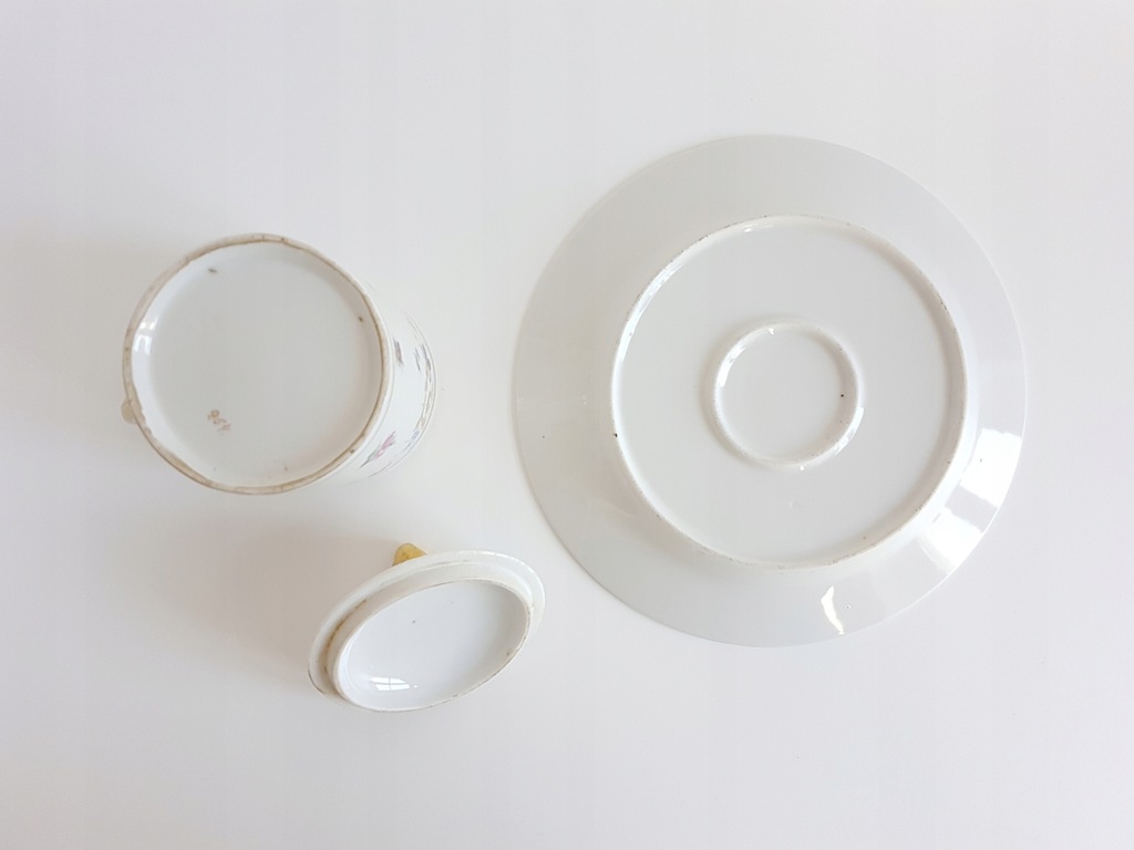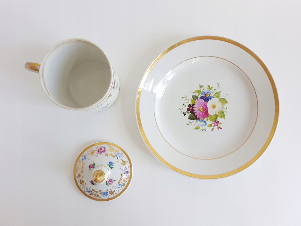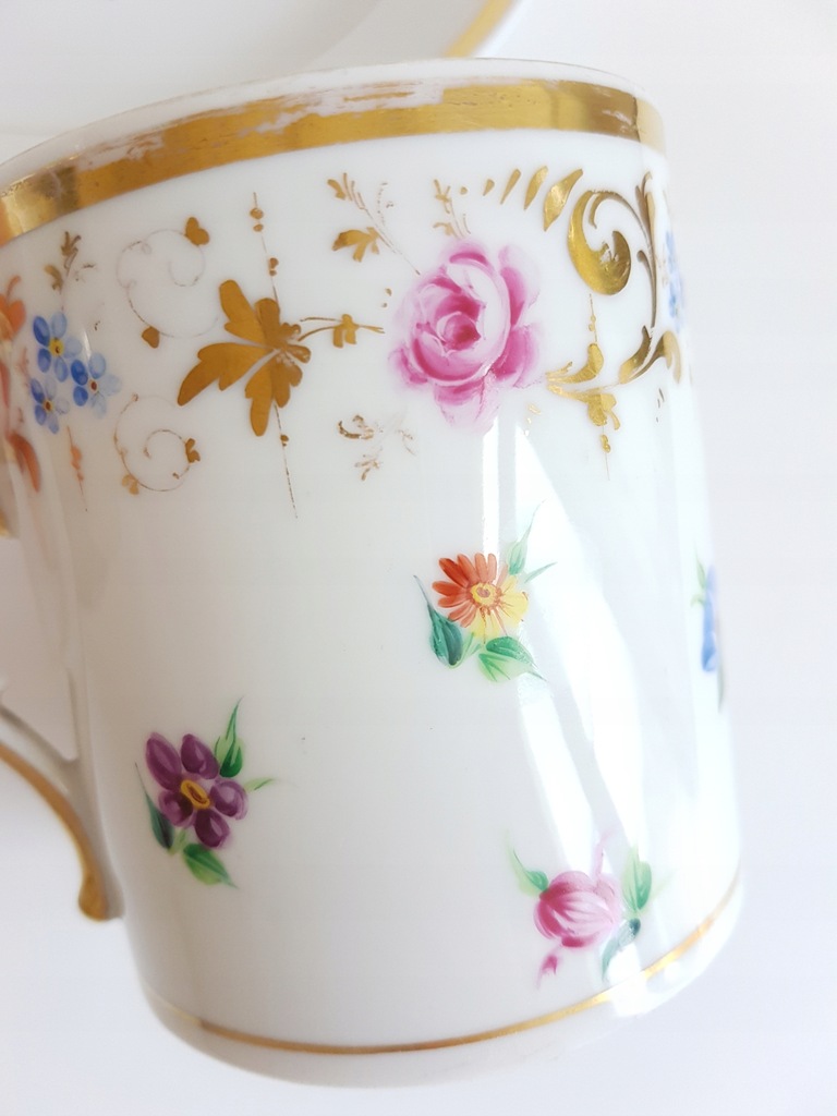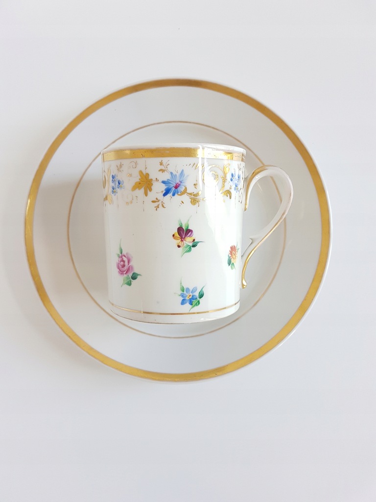 XIX-wieczny porcelanowy kubek z przykrywką i talerzykiem deserowym z malowanymi kwiatami. Kubek dekorowany jest drobnymi kwiatkami rozproszonymi po całej powierzchni i wplecionymi złotymi akcentami. Talerzyk zdobiony bukietem kwiatów w środku lustra i złoceniem na rancie.