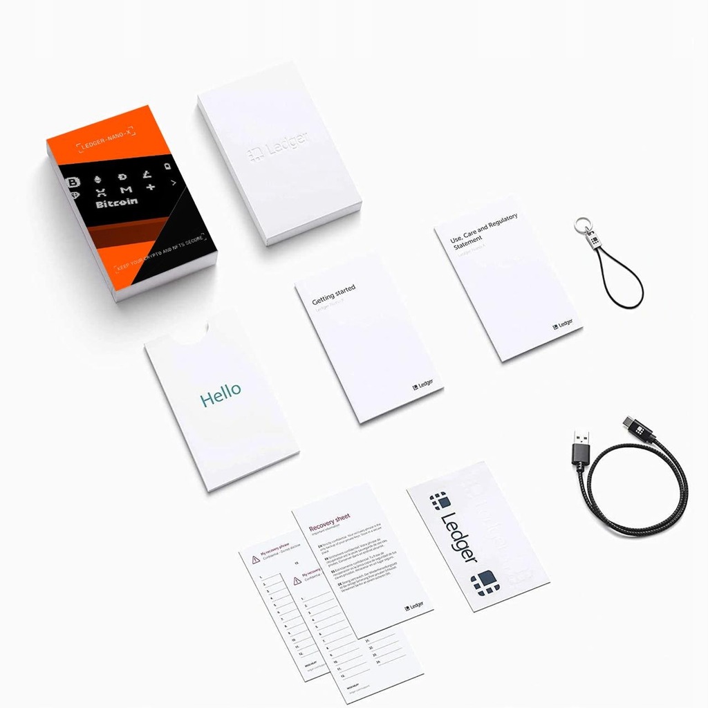 - 1 portfel sprzętowy, 1 kabel USB-C – USB-A, 1 broszura z instrukcją obsługi, 3 arkusze do zapisywania frazy odzyskiwania, 1 smycz na klucze