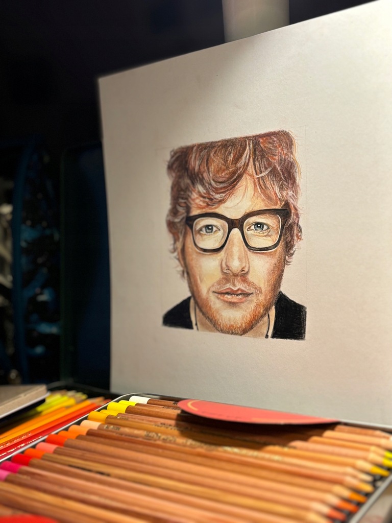 Amatorski portret Eda Sheerana wykonany kredkami na białym papierze Canson 180g/m2, 12x12 cm w ramce 23x23 cm.
