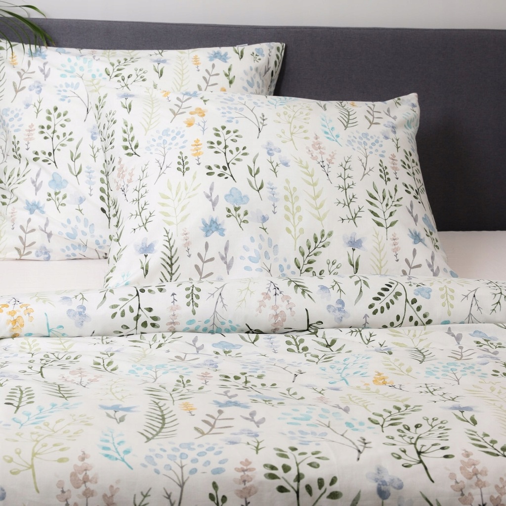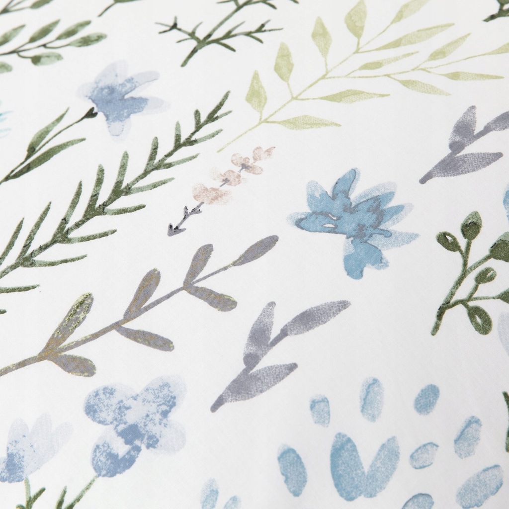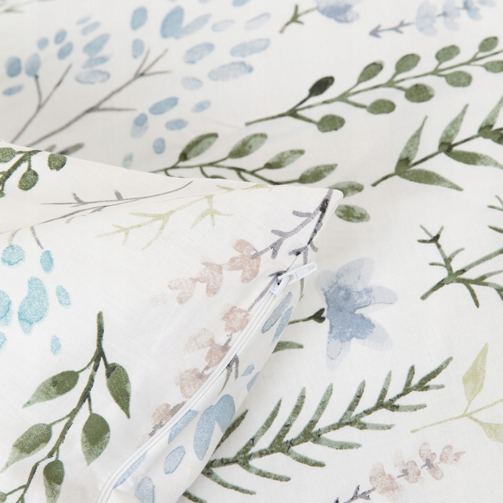 Komplet pościeli FORE składa się z poszwy na pościel o wymiarach 160 x 200 cm oraz dwóch poszewek na poduszkę o wymiarach 70 x 80 cm. Pościel jest zapinana na zamek błyskawiczny, co jest dużym ułatwieniem. FORE wygląda jakby była malowana akwarelami - na białym tle zostały umieszczone kwiaty oraz gałązki w stonowanych barwach.