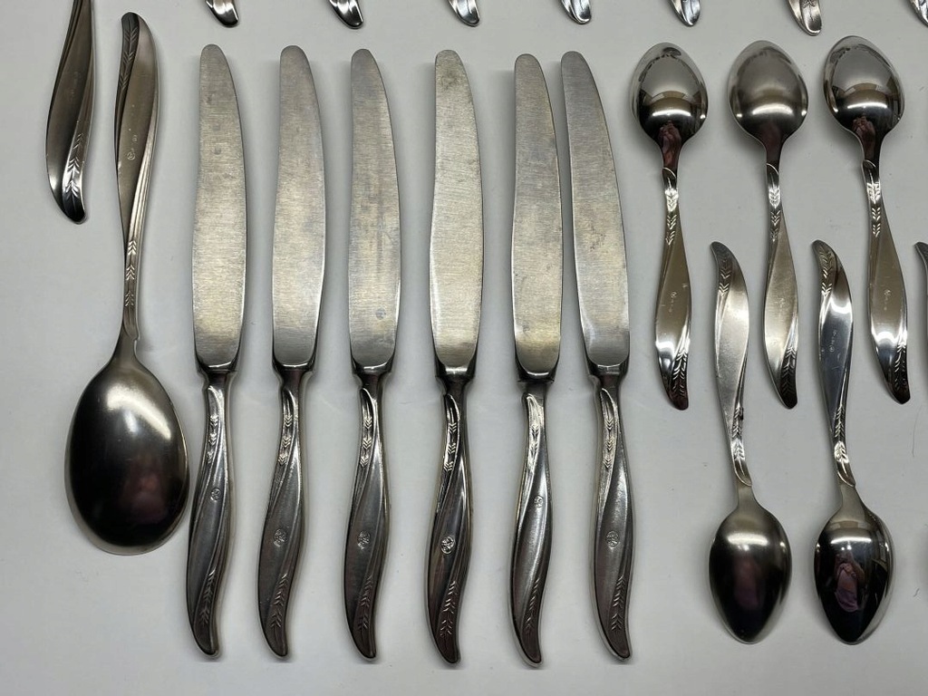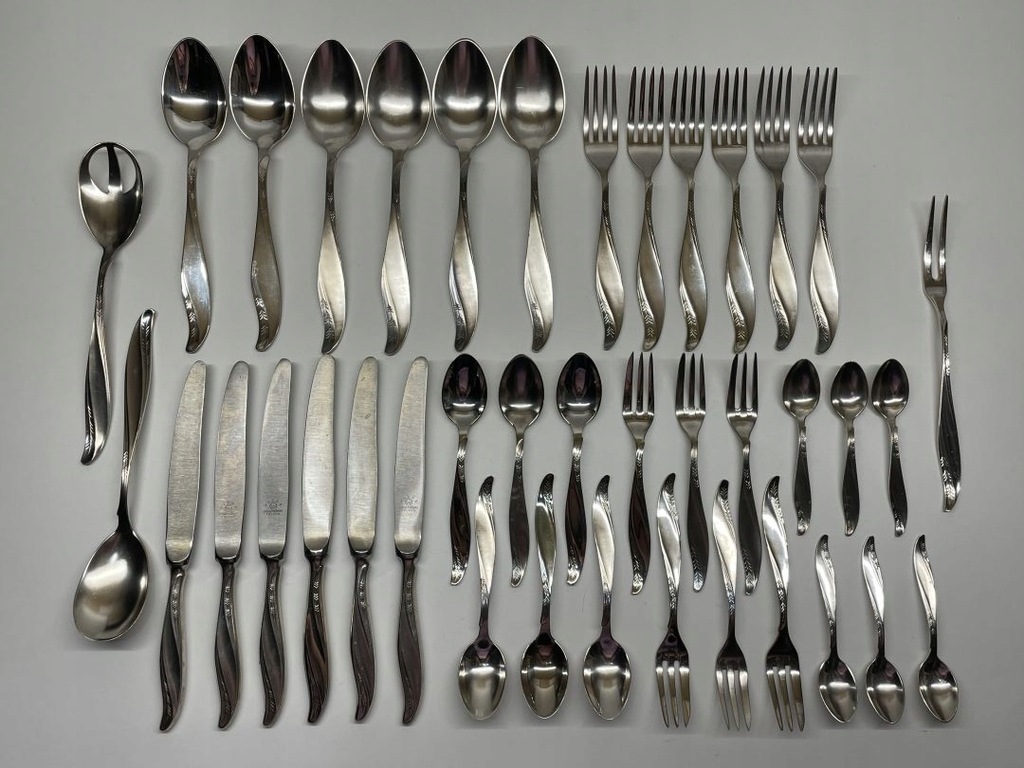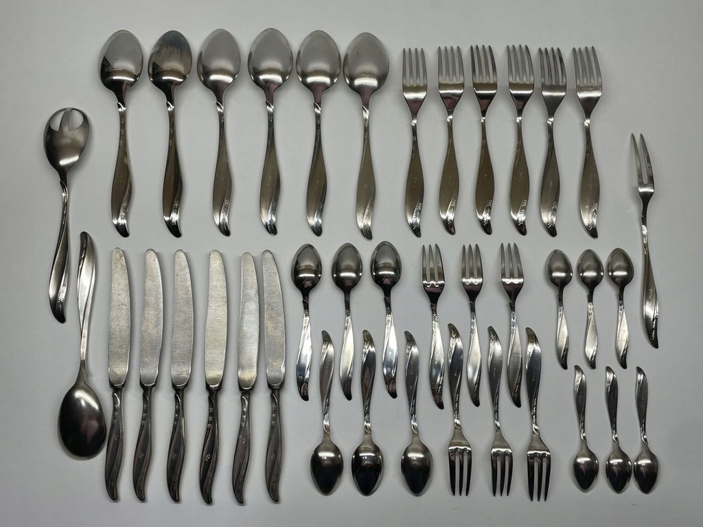 W SKŁAD KOMPLETU WCHODZI: ŁYŻKA STOŁOWA 6 SZTUK, WIDELEC OBIADOWY 6 SZTUK, NÓŻ OBIADOWY 6 SZTUK, ŁYŻECZKA DO HERBATY 6 SZTUK, WIDELCZYK DO CIASTA 6 SZTUK, ŁYŻECZKA DO KAWY 6 SZTUK, WIDELEC DO ZAKĄSEK 1 SZTUKA, SZTUĆCE DO SAŁAT 2 SZTUKI