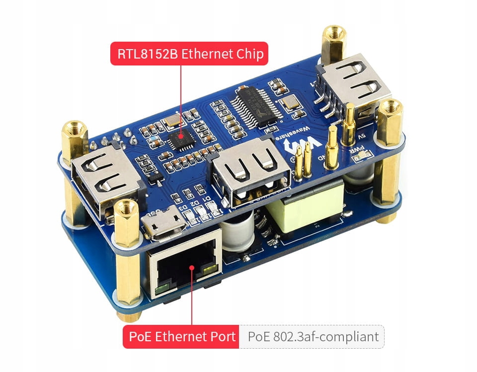 - Zawiera układ Ethernet RTL8152B z portem RJ45 z automatyczną negocjacją 10M / 100M