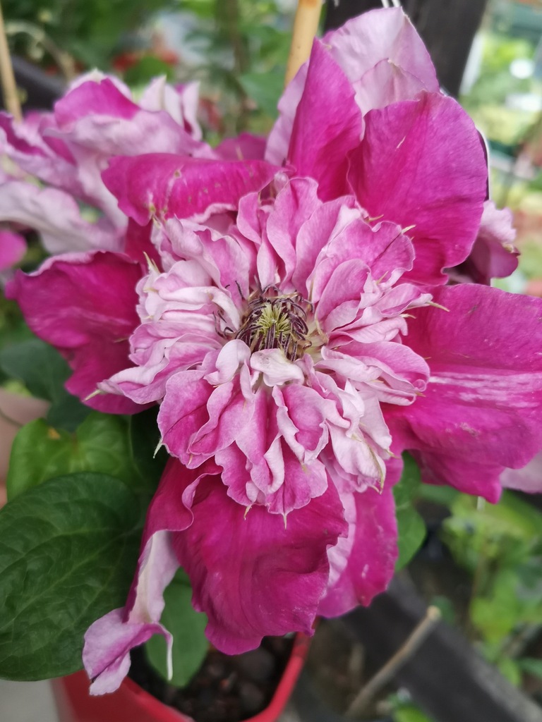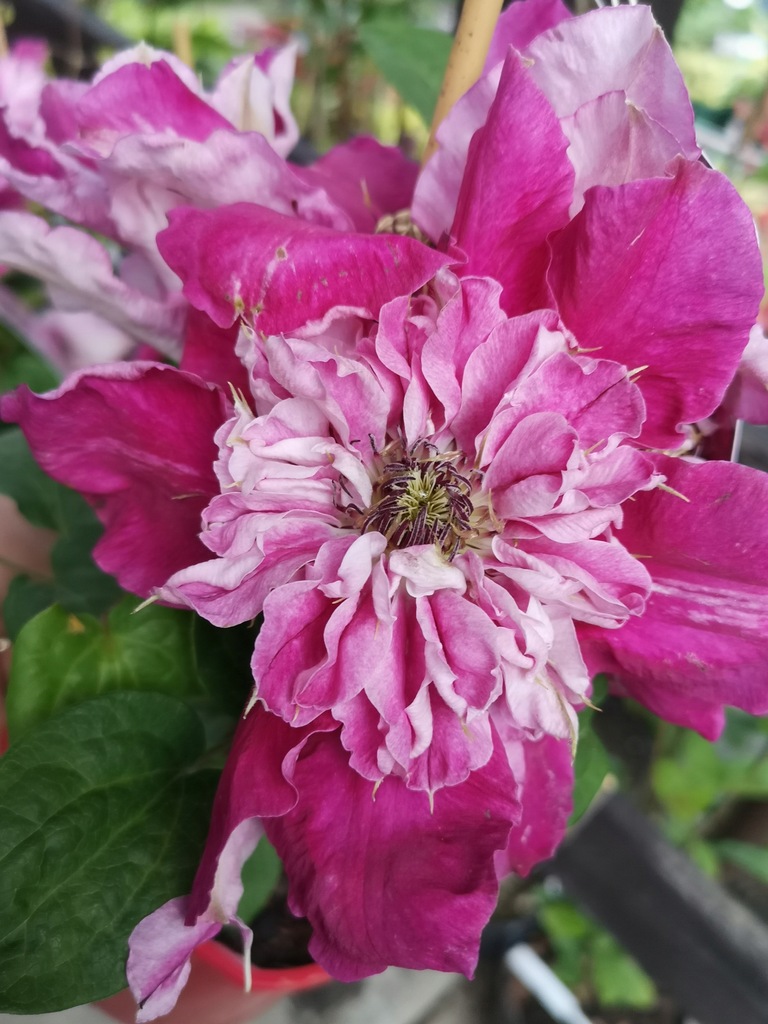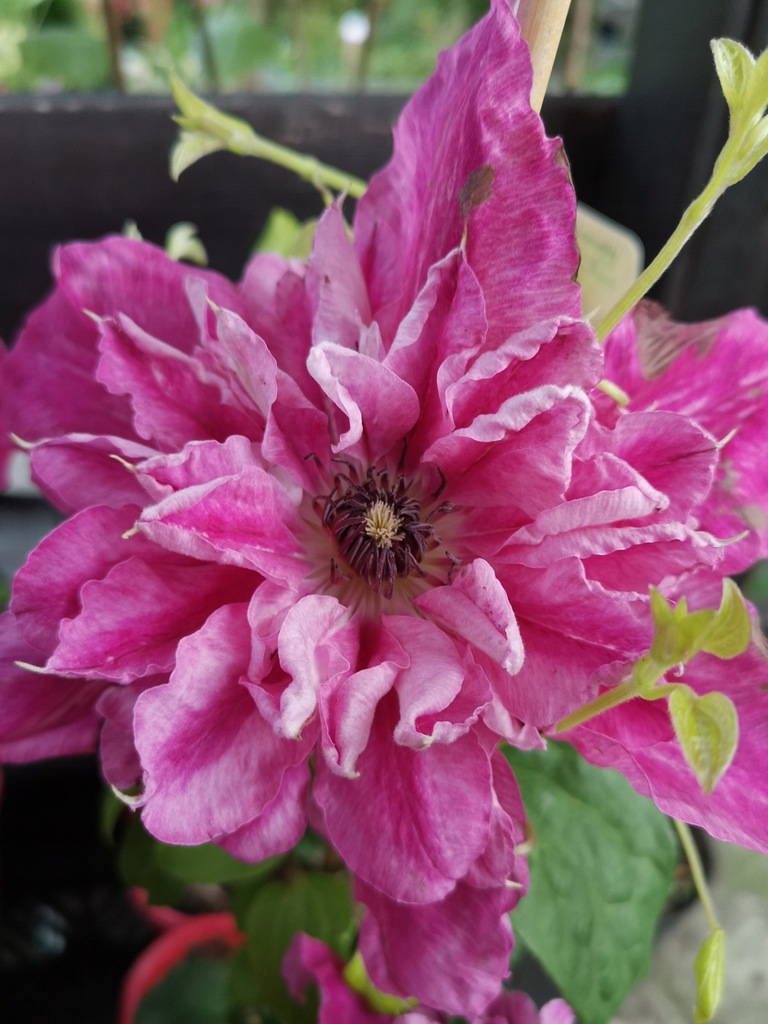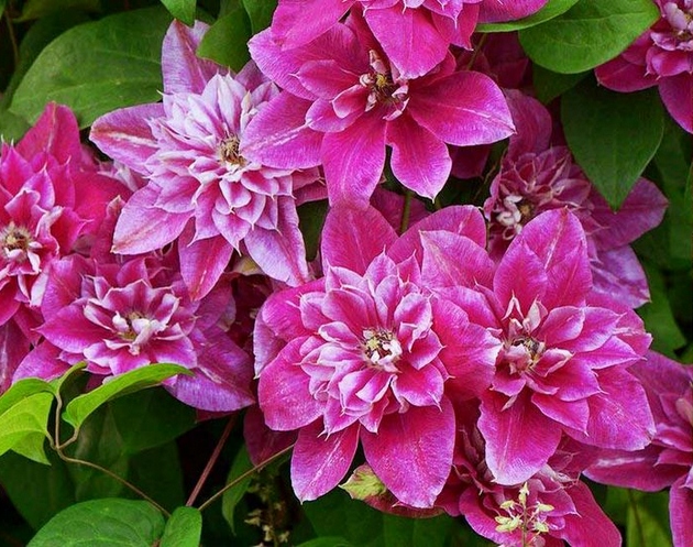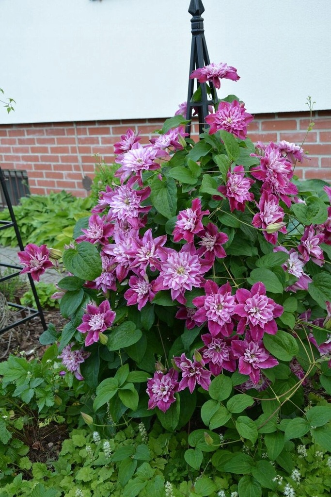 JAK WYGLĄDA: Kwiaty duże, śr. 18–23 cm, czerwonopurpurowe z różowym pasem i jasnoróżowymi przebarwieniami; pełne przy pierwszym kwitnieniu, pojedyncze i półpełne przy drugim kwitnieniu. Kwitnie obficie VI i VII, może powtarzać kwitnienie we IX. Liście ciemnozielone, całobrzegie, pojedyncze, sercowate i trójdzielne, złożone z eliptycznych, ostro zakończonych listków.