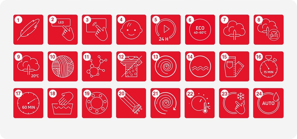 - Program AntyalergiczneSpecjalny program, który usuwa praktycznie wszystkie alergeny, resztki detergentów, roztocza i bakterie, czego efektem jest zdezynfekowane i wolne od alergenów pranie.