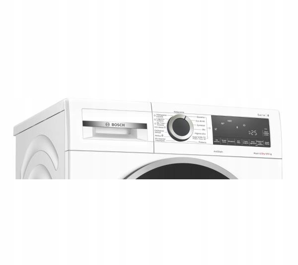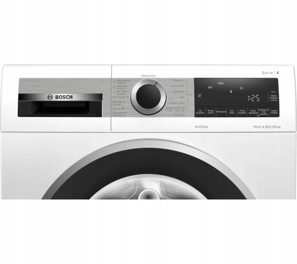 - Dodatkowe opcje: AntiStain - funkcja odplamiania 6 najbardziej uporczywych plam, mniej zagnieceń, możliwość skracania czasu prania, silnik EcoSilence Drive, Start/Stop z możliwością dołożenia prania, wybór czasu suszenia , wybór stopnia suszenia, wyświetlacz LED, wyświetlanie czasu do końca programu