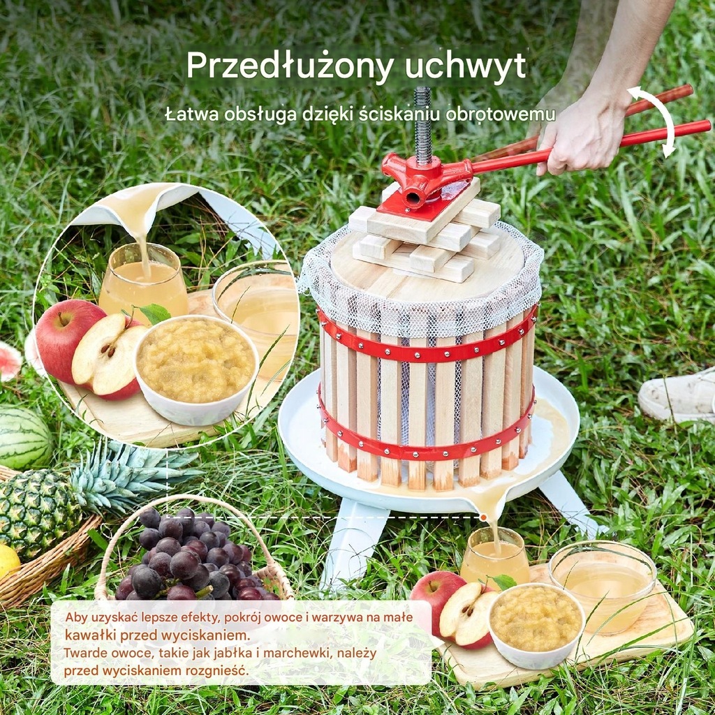 Nasza prasa do owoców i wina posiada ulepszony system bloków naciskowych, który umożliwia efektywne wyciskanie i szybkie pozyskiwanie soku. Z przedłużonym, obrotowym uchwytem, prasa jest wyjątkowo łatwa w obsłudze – Twój ulubiony napój będzie gotowy w zaledwie kilka minut!
