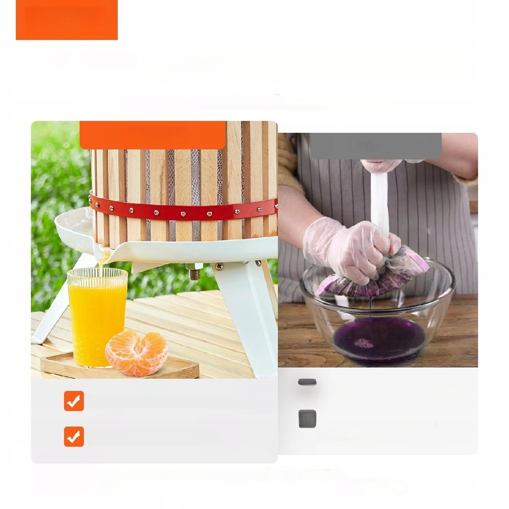 Dzięki 6 solidnym blokom wyciskającym z drewna Zelkova, nasza prasa do owoców i wina zwiększa nacisk, umożliwiając bardziej efektywne wyciskanie soku w porównaniu z tradycyjnymi metodami. Teraz możesz w kilka minut cieszyć się świeżym, naturalnym sokiem – prosto i efektywnie, idealne do kuchni lub winiarni!