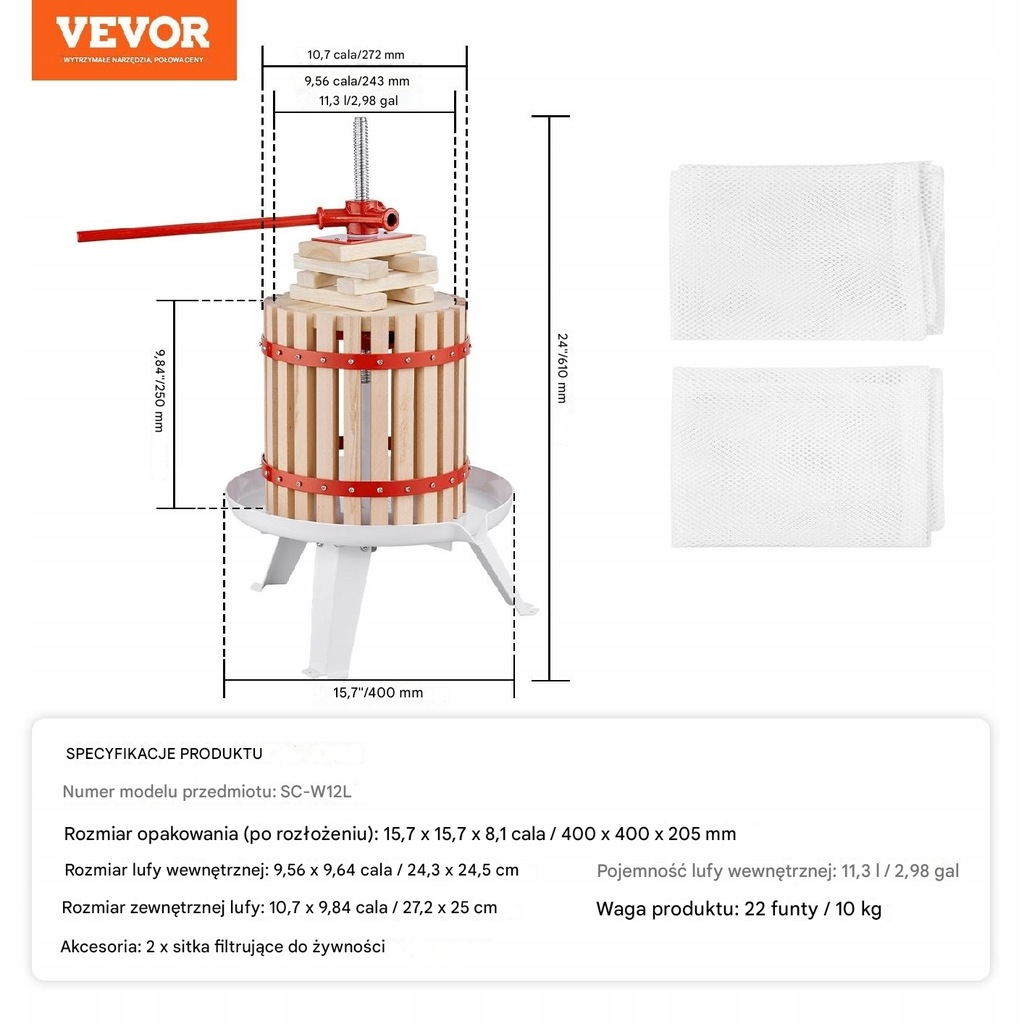Możliwość prasowania od 6 do 10 kg owoców i warzyw. Idealny do produkcji naturalnych soków oraz win owocowych.