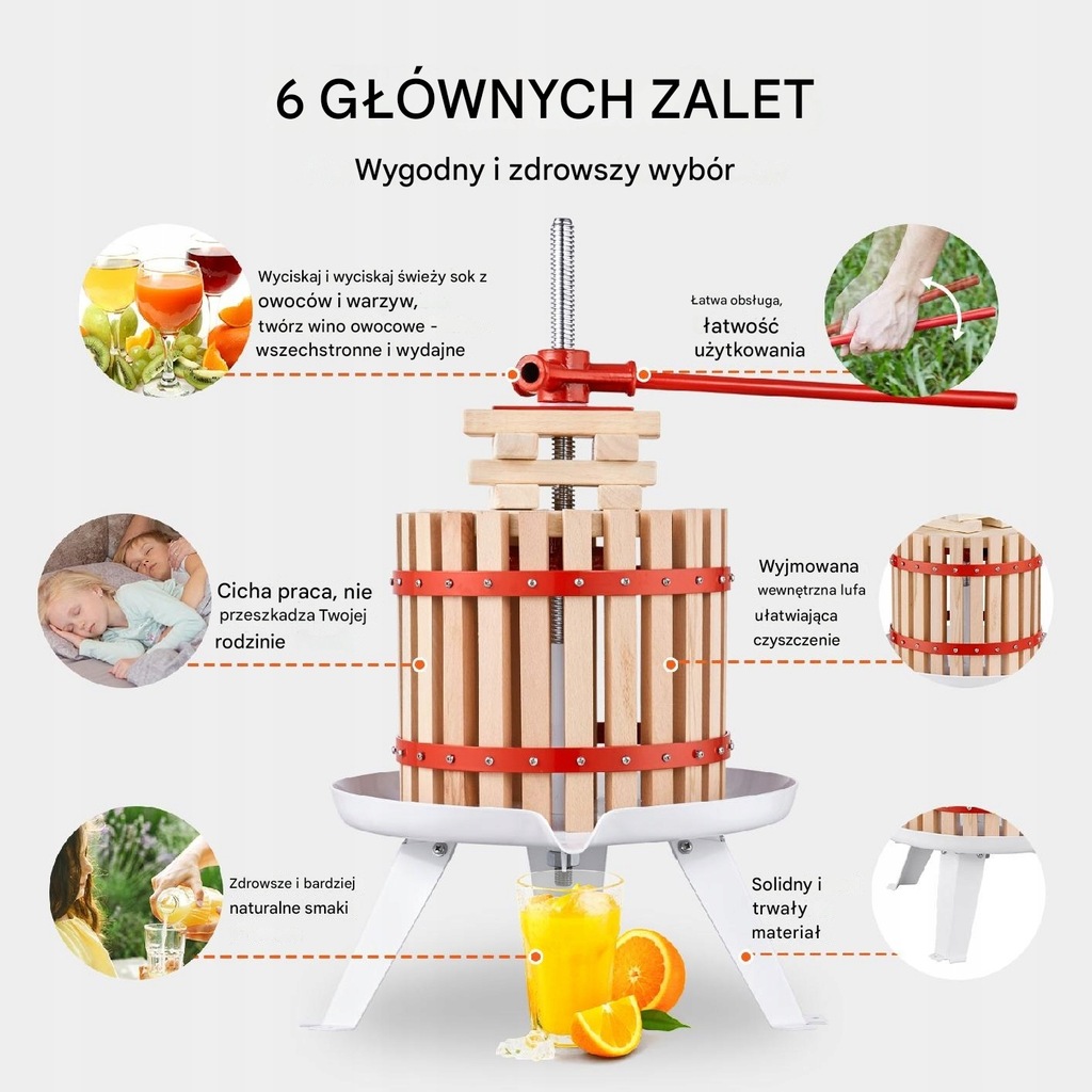 Prasa do wina sprawdzi się przy wyciskaniu soku z owoców i warzyw, a także przy produkcji sera, puree owocowego, oliwy z oliwek i wielu innych. Czas cieszyć się pełnym smakiem własnych zbiorów i poczuć orzeźwienie!