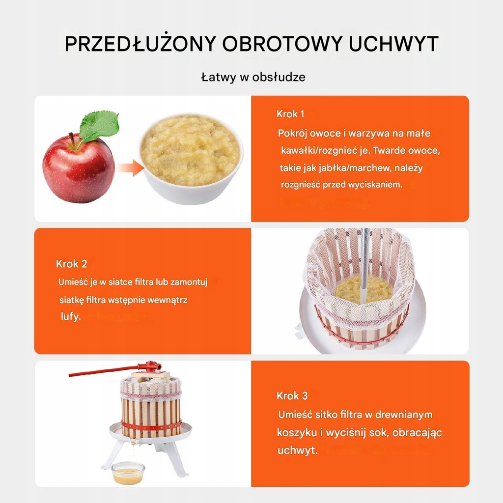 Ułatwia obsługę dzięki długiemu uchwytowi. Krok 1: Pokrój owoce i warzywa na małe kawałki. Krok 2: Umieść w siatce filtra. Krok 3: Umieść sitko w drewnianym koszyku i wyciśnij sok, obracając uchwyt.
