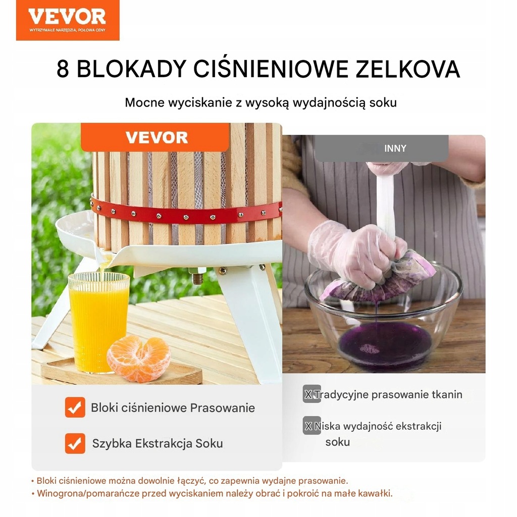 Dzięki 8 solidnym blokom wyciskającym z drewna Zelkova, nasza prasa do owoców i wina zwiększa nacisk, umożliwiając bardziej efektywne wyciskanie soku w porównaniu z tradycyjnymi metodami. Teraz możesz w kilka minut cieszyć się świeżym, naturalnym sokiem – prosto i efektywnie, idealne do kuchni lub winiarni!