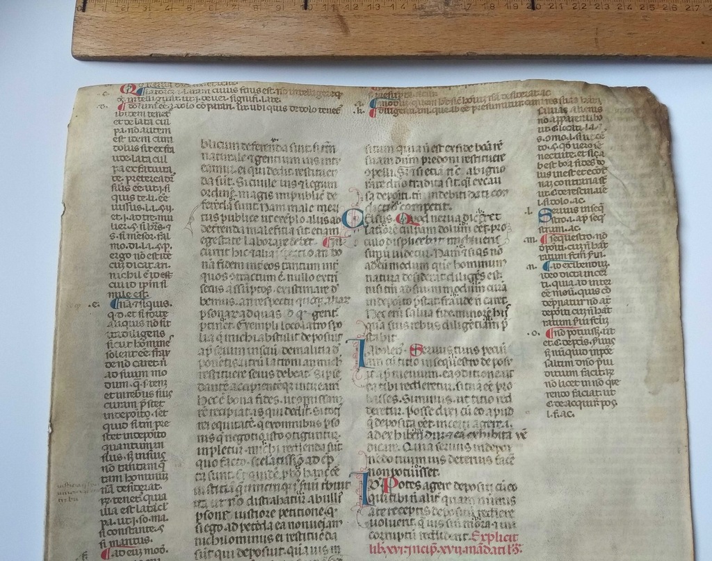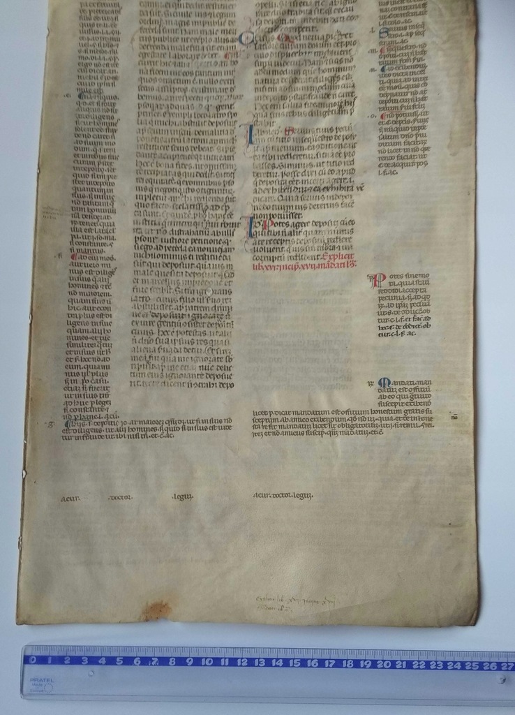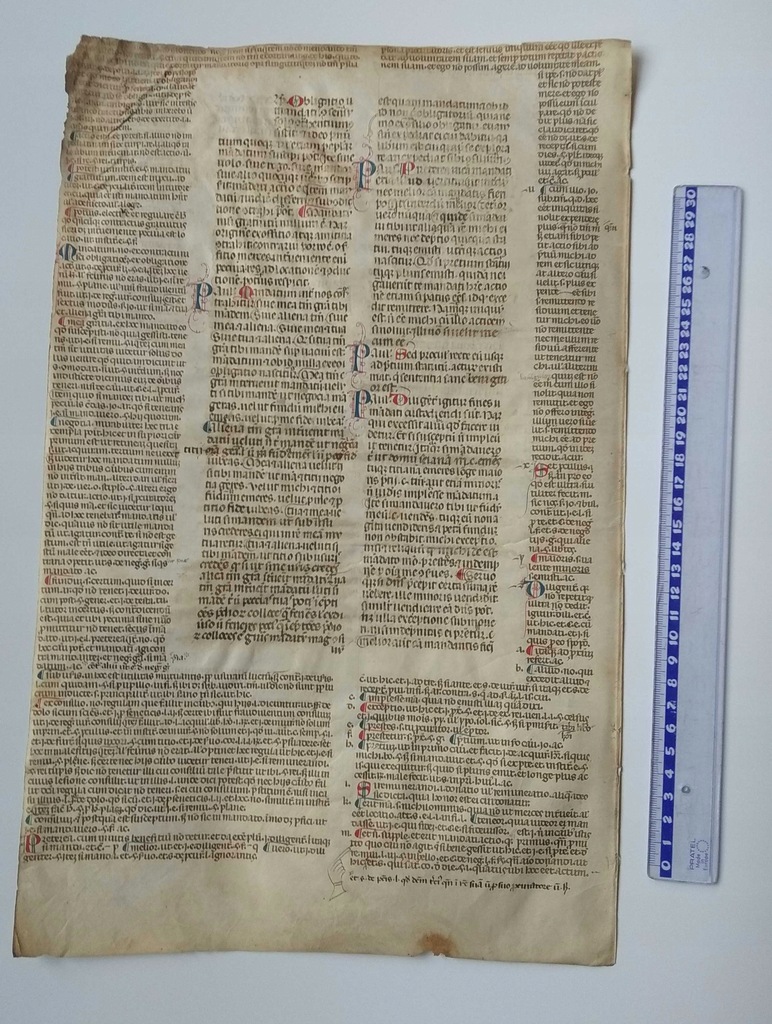 Karta pergaminowa z rękopisem łacińskim sporządzonym ok. 1250-1350 roku z kolorowymi inicjałami. Nabywca otrzyma opinię historyka znającego biegle łacinę i zajmującego się średniowieczem (tytuł naukowy doktora habilitowanego). Gwarancja autentyczności oraz legalnego pochodzenia. Brak pieczęci i wpisów własnościowych.