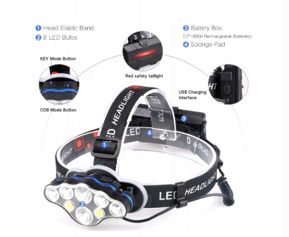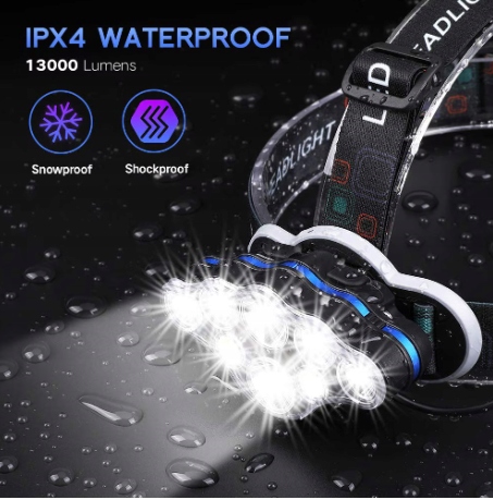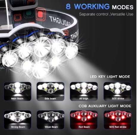 ULTRA BRIGHT: The headlight consists of 8 LED bulbs and a red safety light, with a maximum brightness of 13,000 lumens and a lighting radius of 400 meters, which will help you see your surroundings clearly and keep you away from danger. It comes with a USB cable and 2 rechargeable batteries to provide a stronger light.