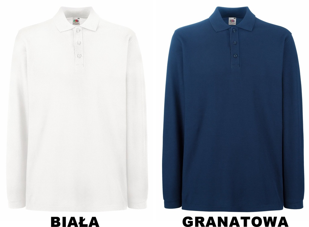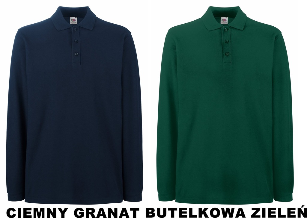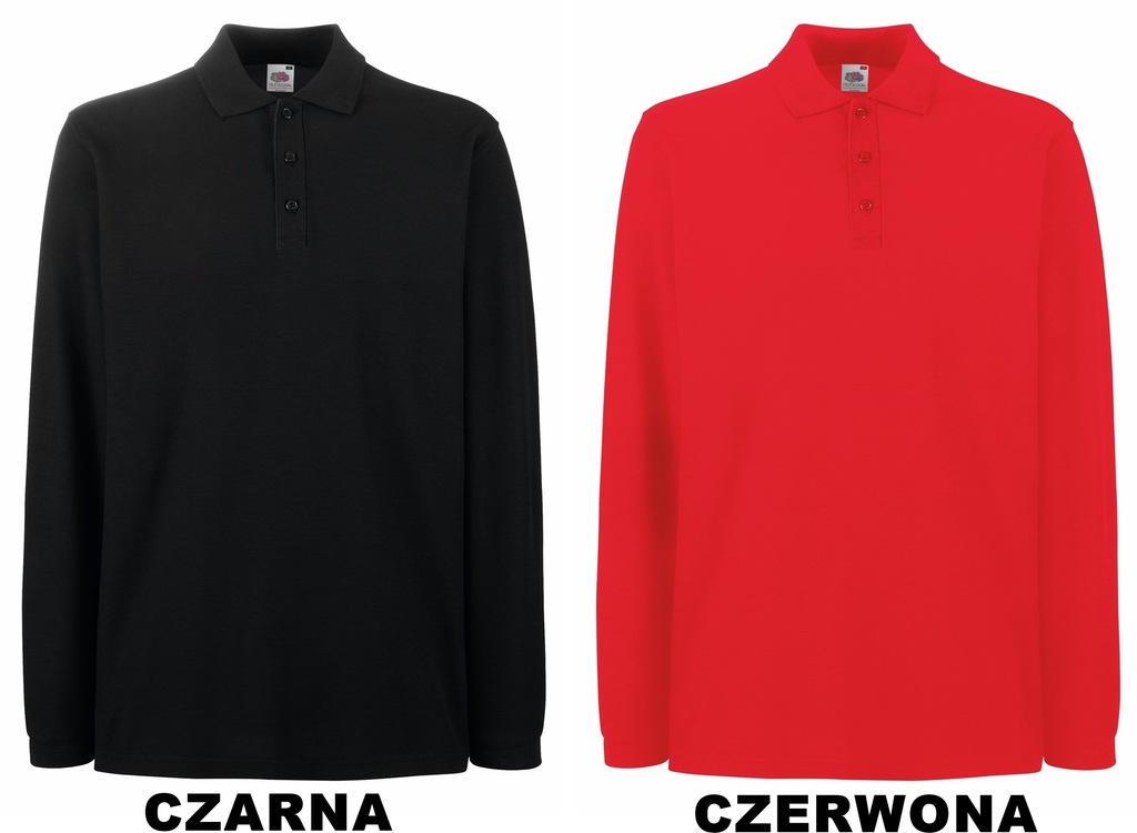 Koszulki polo męskie marki Fruit Of The Loom model Premium Polo w wersji z długim rękawem. Wykończone ściągaczem z bawełny z elastanem. Koszulki Polo zapinane na trzy guziki w tym samym kolorze. Rozcięcie po bokach na dole koszulki. Taśma wzmacniająca wzdłuż karku.