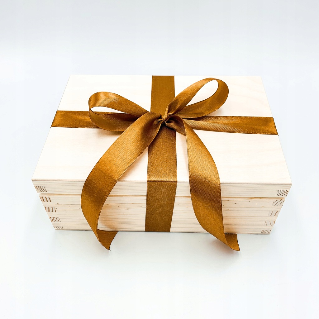 Pudełko przewiązane w elegancki sposób wstążką w odcieniach miedzi.